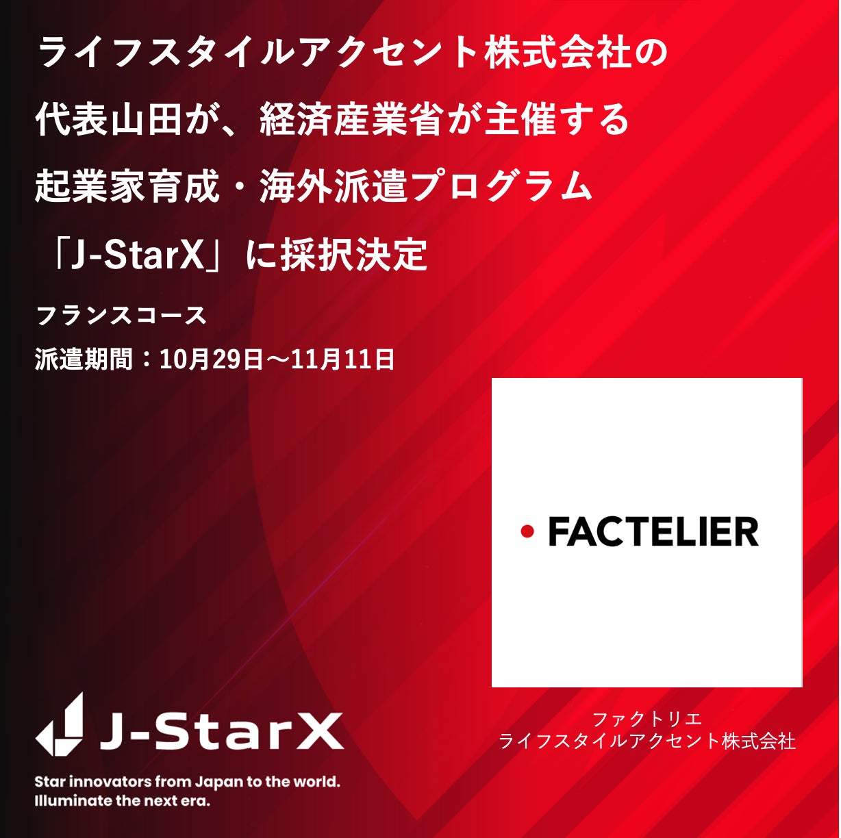 メイドインジャパンの工場直結ファッションブランド「ファクトリエ」を運営するライフスタイルアクセント株式会社は、2023年10月29日~11月11日に、フランスにて行われる海外派遣プログラム「J-StarX」フランスコースに、同社代表山田の参加が決定したことをお知らせいたします。本決定には、国内での事前プログラムや審査等を経て、今後海外での成長が期待される起業家として評価をいただき、派遣が決定いたしました。