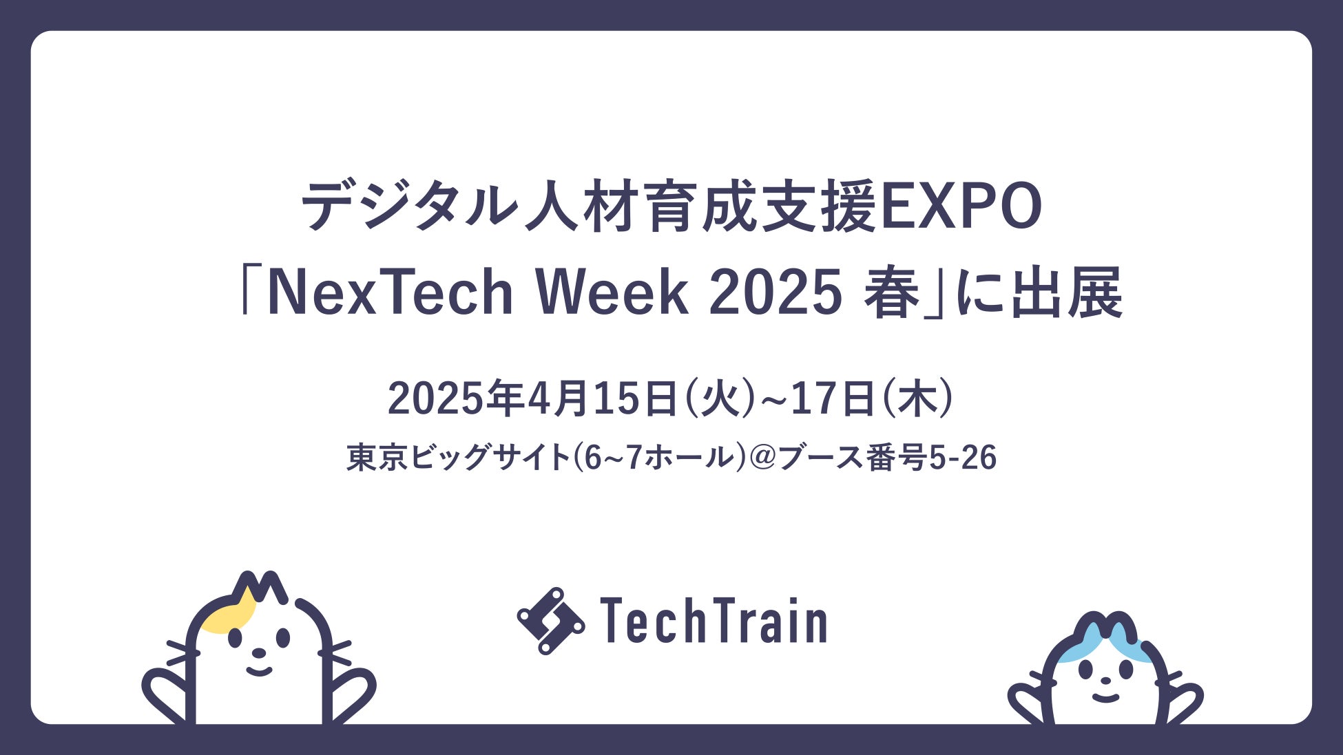 デジタル人材育成支援EXPO「NexTech Week 2025 春」に出展します。TechTrainプラットフォームの教育課題を実際に体験いただけます。採用・研修に関する個別無料相談も実施予定!