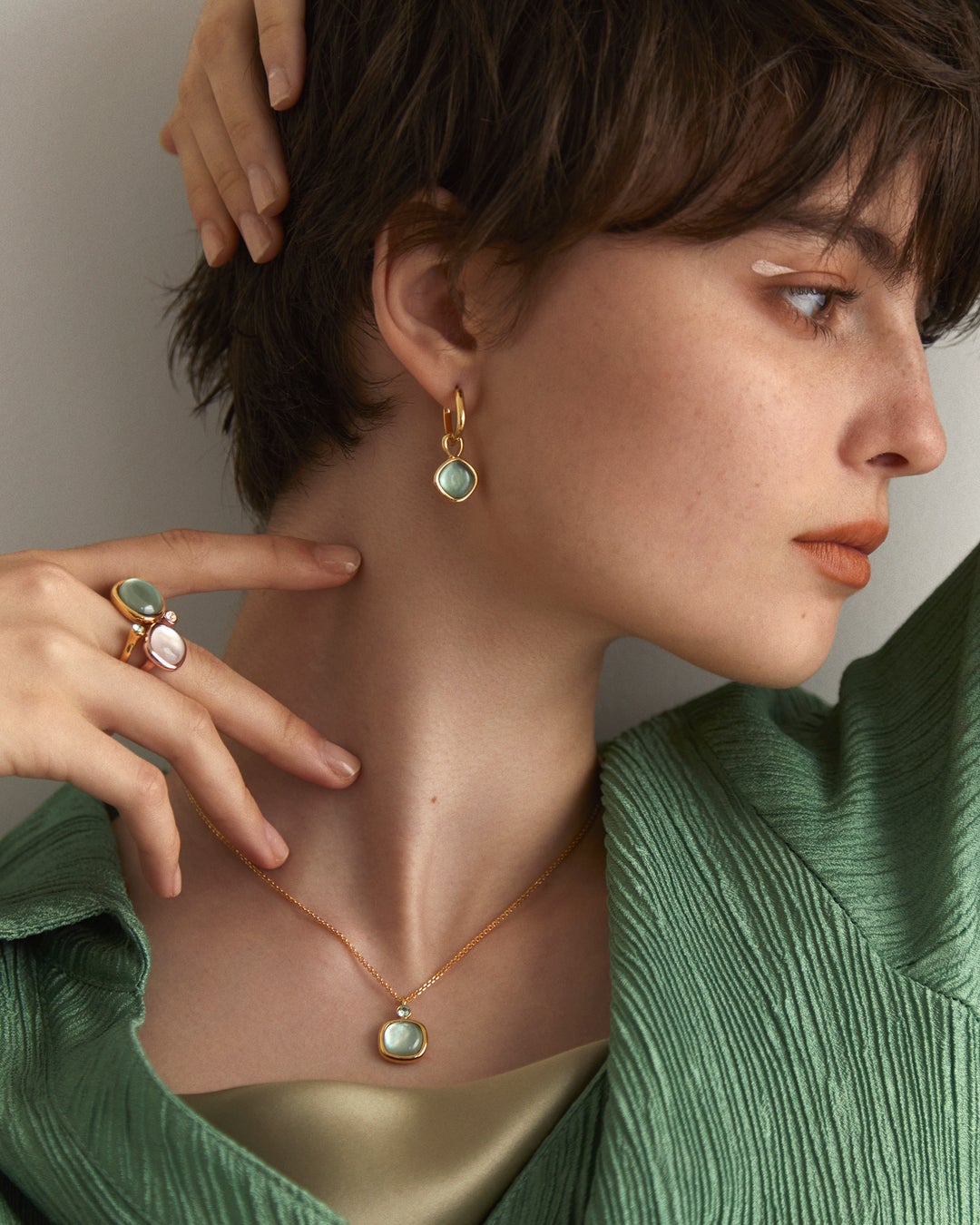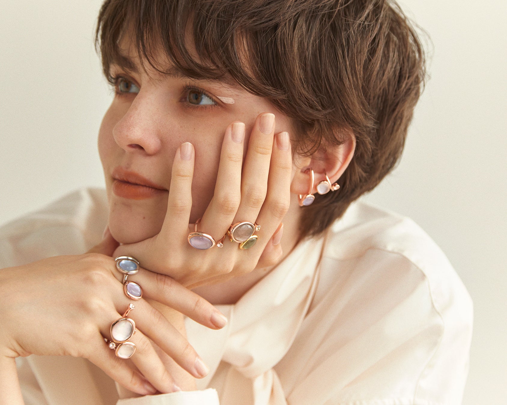 白蝶貝に合成石またはガラスを貼り合わせたオリジナルのダブレットストーンを使用し肌に自然に馴染むニュアンスカラーを表現。奥行きのある艶やかな透け感が魅力です。