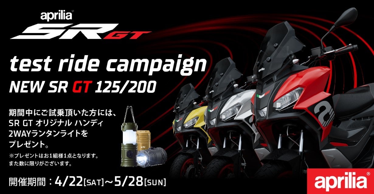 この『SR GT 125/200 試乗キャンペーン』は、昨年に販売を開始したSR GT 200に続き、2023年には125ccバージョンを加え、カテゴリー最高レベルのパワーを誇るエンジンの俊敏な加速感と、ロングトラベルサスペンションの高い走破性による楽しい乗り心地を多くの方に体験していただけるキャンペーンです。ご試乗予約はWEB上の専用フォームからご希望の正規販売店へお問い合わせも可能で、ご試乗いただいた方には、アウトドアや停電時にも活躍するapriliaロゴ入りLEDコンパクト2WAYランタンをプレゼントいたします。