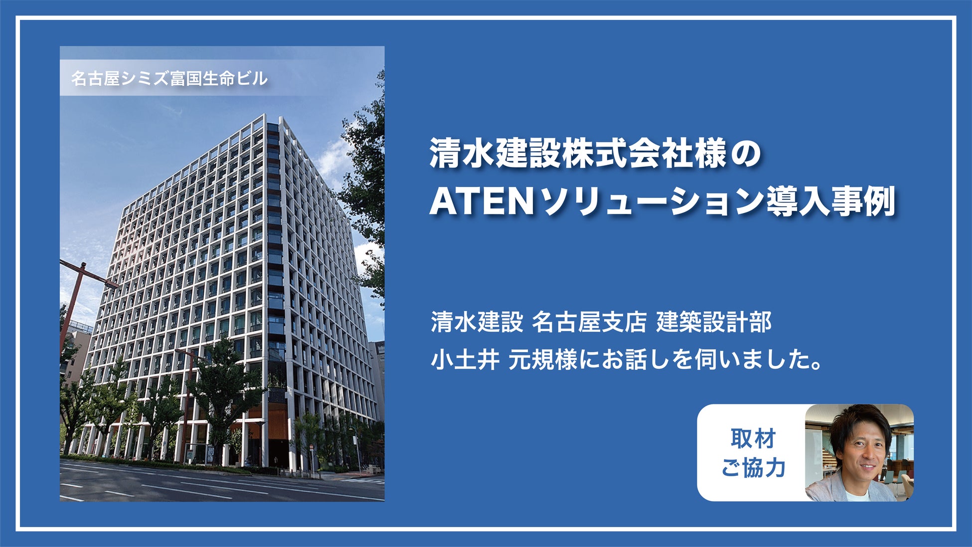 清水建設 名古屋支店様では、2024年に開業された名古屋シミズ富国生命ビル内で、社員の集う場で大型のディスプレイを設置し、それらを操作する機器などにATEN製品を多数、採用いただきました。社内外のコミュニケーション活性化を図るため、10階と11階の2フロアにまたがるスペースで36面の大型マルチディスプレイを設置し、ATENの映像伝送延長機や端末操作機器を使って各拠点との会議や震災対策訓練などの社内や事業所間のコミュニケーション・ツールとして活用しています。この大型マルチディスプレイの導入の背景や効果について、清水建設 名古屋支店 建築設計部の小土井元規様にお話をお聞きしました。