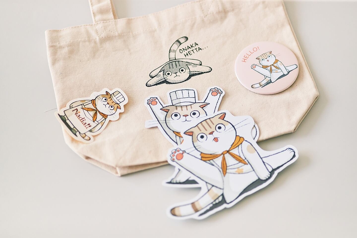 今回は、オリジナルキャラクター「にゃでぃあ」のグッズも販売開始となりました。トートバッグ(カラー:ナチュラル・レッド・スカイブルー)、型抜きポストカード、ステッカー、ミラー缶バッジを販売します。