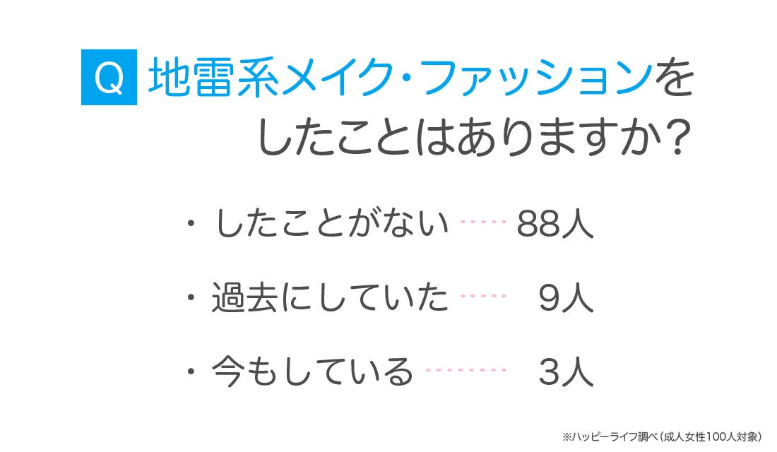 また、「地雷系メイク・ファッションをしたことはありますか?」という質問に対して「したことがない」が88名、「過去にしていた」が9名、「今もしている」が3名という結果になりました。