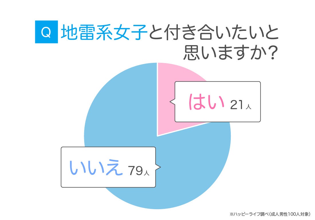 男性100人に「地雷系女子と付き合いたいと思いますか?」と質問したところ、「はい」と答えたのは21人、「いいえ」と答えたのは79人でした。