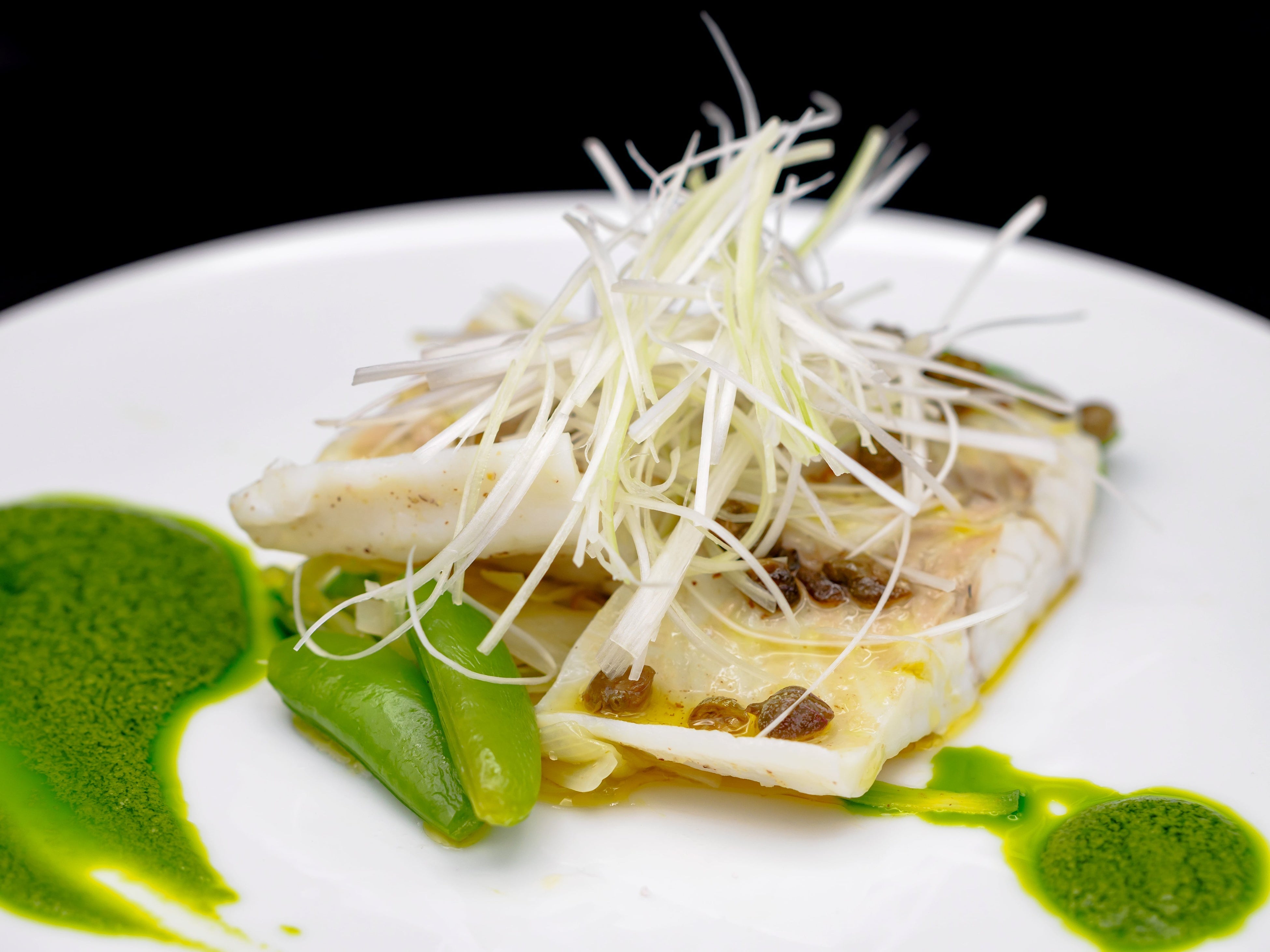 身がふっくらとなるように蒸し上げたスズキを2種のソースで仕上げました。