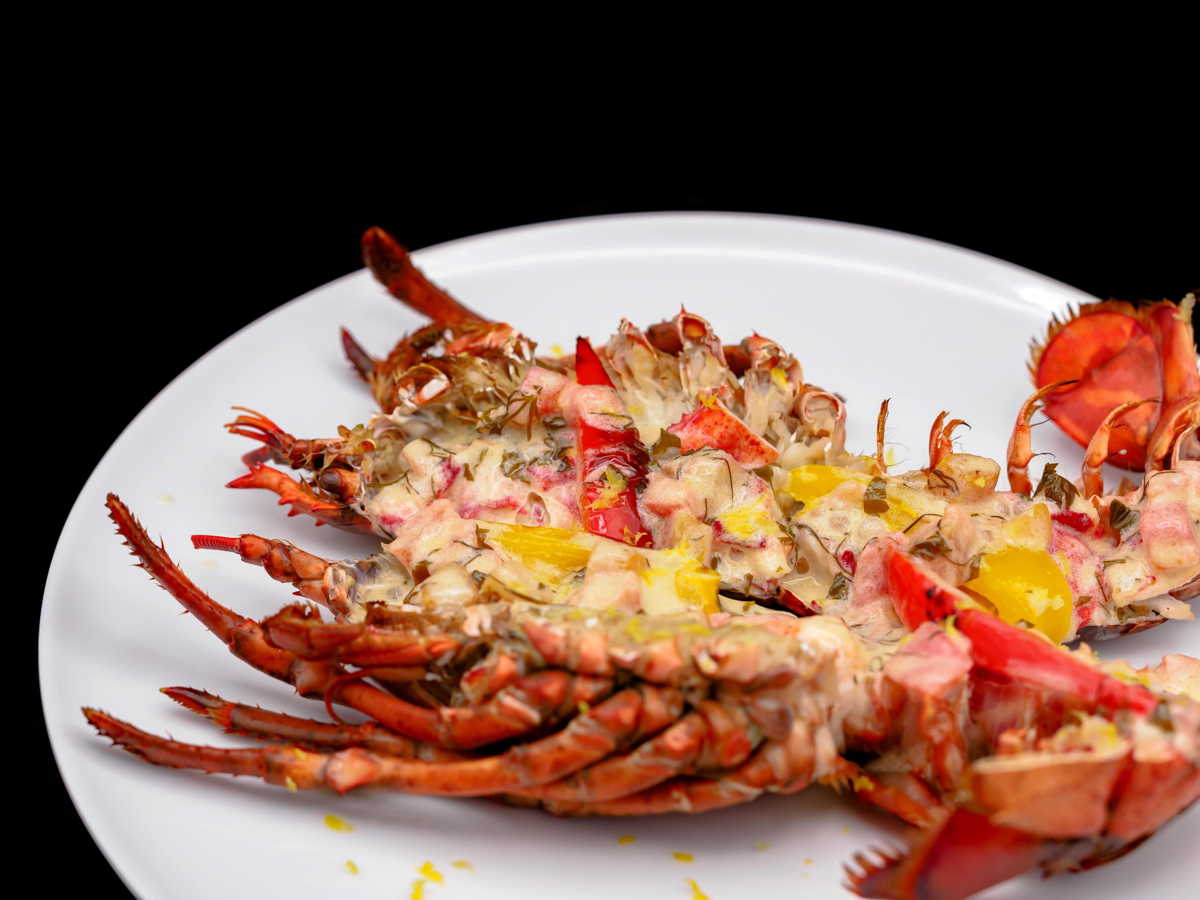 今月のロブスター料理は、丸々一尾を香ばしくローストし、タピオカとハーブのクリームソースで仕上げました。