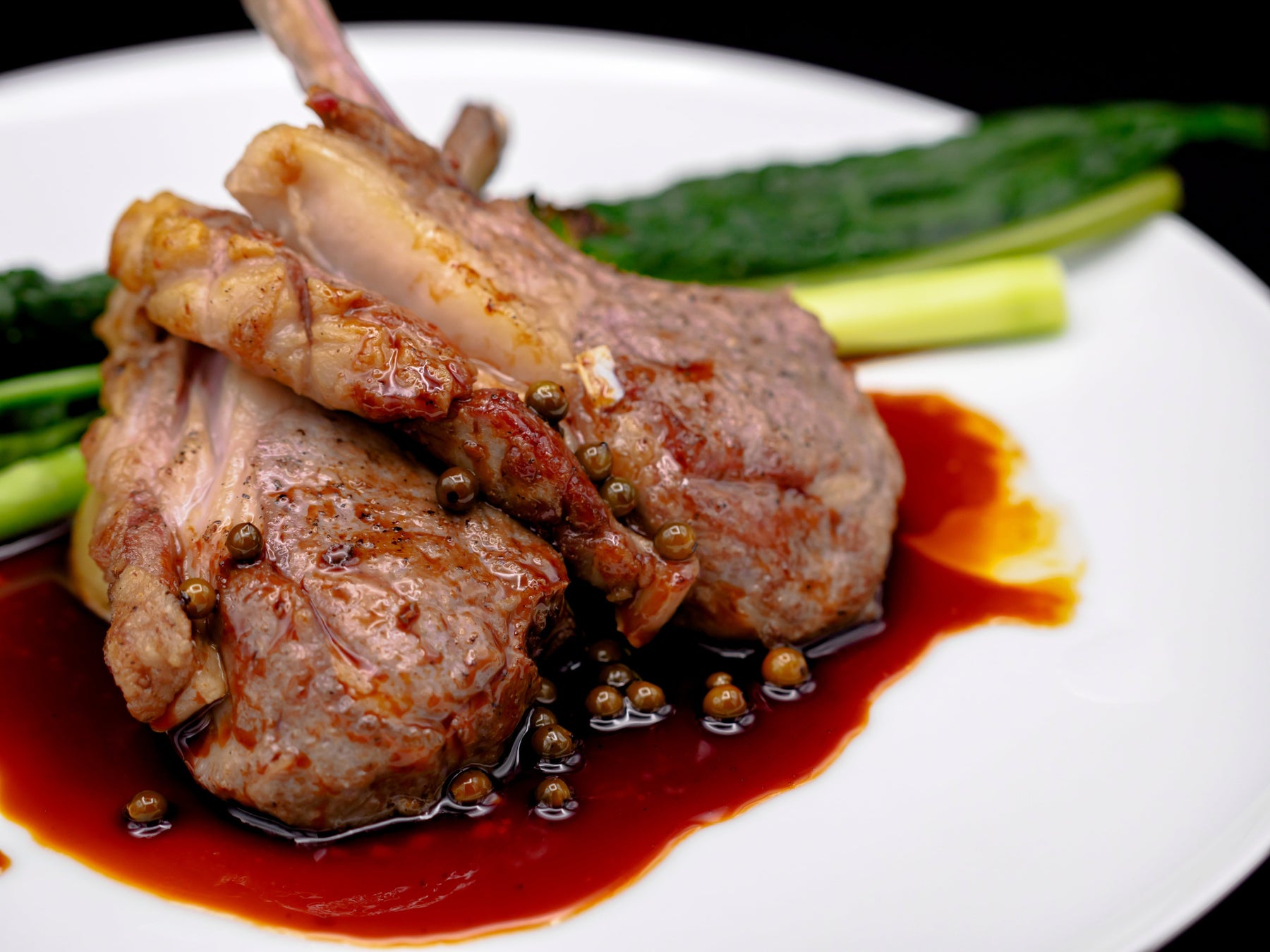 骨付きの仔羊をじっくりと焼き上げ、生胡椒のマディラソースで仕上げました。
