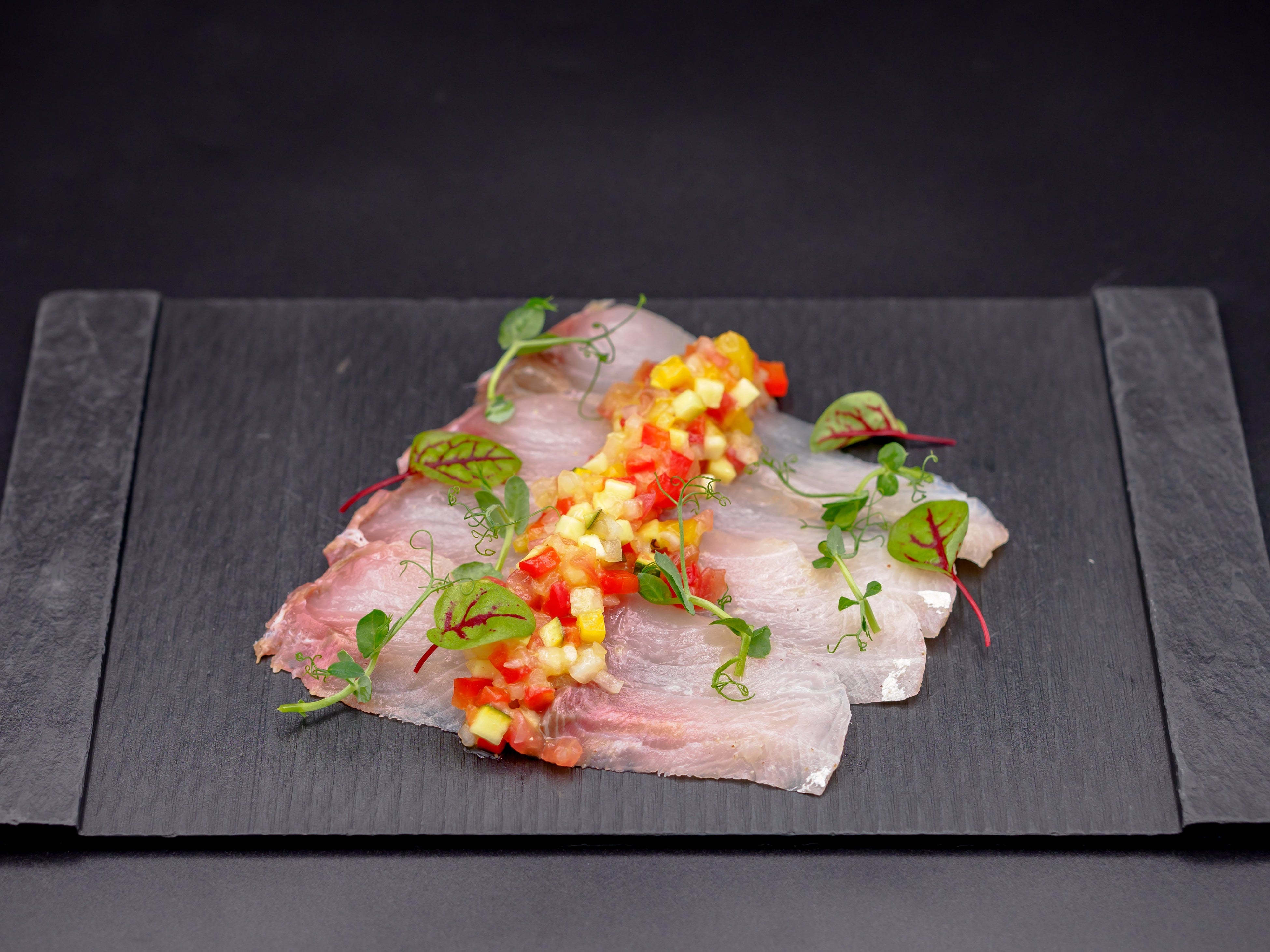 奥深い甘みと旨みを感じるカンパチをパプリカやズッキーニなどのみずみずしい夏野菜をみじん切りにしたラヴィゴットソースで仕上げました。