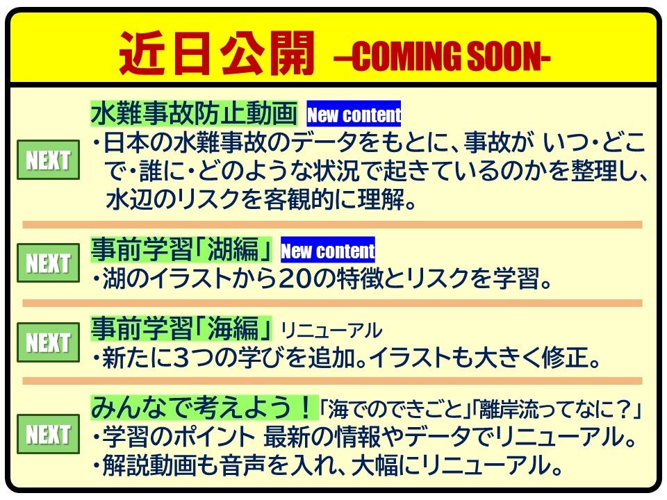 加えて、【みんなで考えよう!】「海でのできごと」「離岸流ってなに?」についても、学習のポイントを最新の情報やデータに更新し、解説動画に音声を加えるなど大幅にリニューアルする予定です。