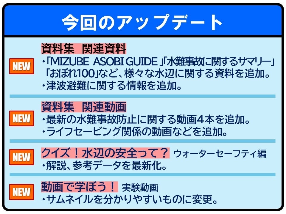 関連資料では、1万人以上を対象とした水辺の調査結果「『海のそなえ』水難事故に関するサマリー」や「これで溺れた『おぼれ100』」などの事故防止に関する最新情報に加え、「MIZUBE ASOBI GUIDEミズベアソビガイド」などの水辺に関する資料を追加しました。さらに津波避難に関する情報も掲載しています。