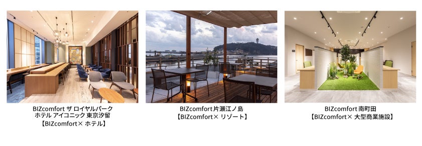 コワーキングスペースやレンタルオフィスの提供だけでなく、全く別のサービスと組み合わせて展開することで、はたらく人々に新し いワークプレイスを提供します。これまでも、ホテル、大型商業施設内や、プチワーケションがたのしめるリゾート地など、別サービス を融合し出店してきました。これからもさまざまなサービスを組み合わせた拠点を積極的に展開していき、出張先や旅先、買い 物ついでに『ビズコンフォート』を利用していただくことで、より身近な存在になることを目指します。