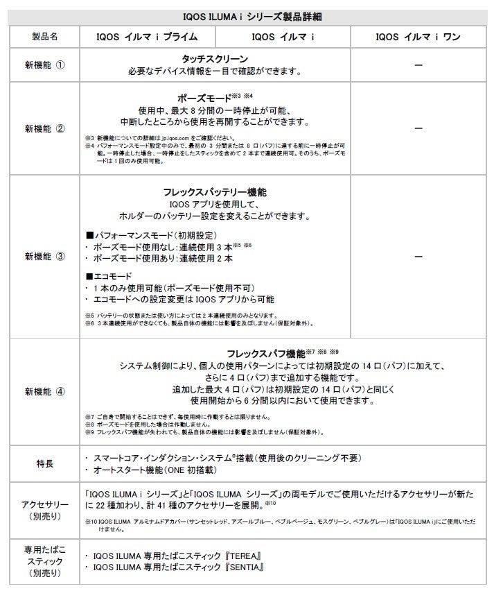 今回、日本で発売される「IQOS イルマ i シリーズ」は、「IQOS イルマ i プライム」、「IQOS イルマ i」、そして「IQOS イルマ i ワン」の3機種での展開となります。「IQOS イルマ i プライム」および「IQOS イルマ i」では、これまでの「IQOS イルマ プライム」および「IQOS イルマ」になかったタッチスクリーンが搭載され、必要な情報が一目で確認できるほか、最大8分間のポーズモード機能があります。また、3機種とも、フレックスパフ機能※2を搭載し、ユーザーの使用ペースに応じてお使いいただけます。「IQOS イルマ i ワン」ではオートスタート機能が加わり、使用前のボタン操作が不要になりました。どのモデルもスマートコア・インダクション・システムⓇを搭載しており、燃焼させず内側からたばこ葉を加熱します。
