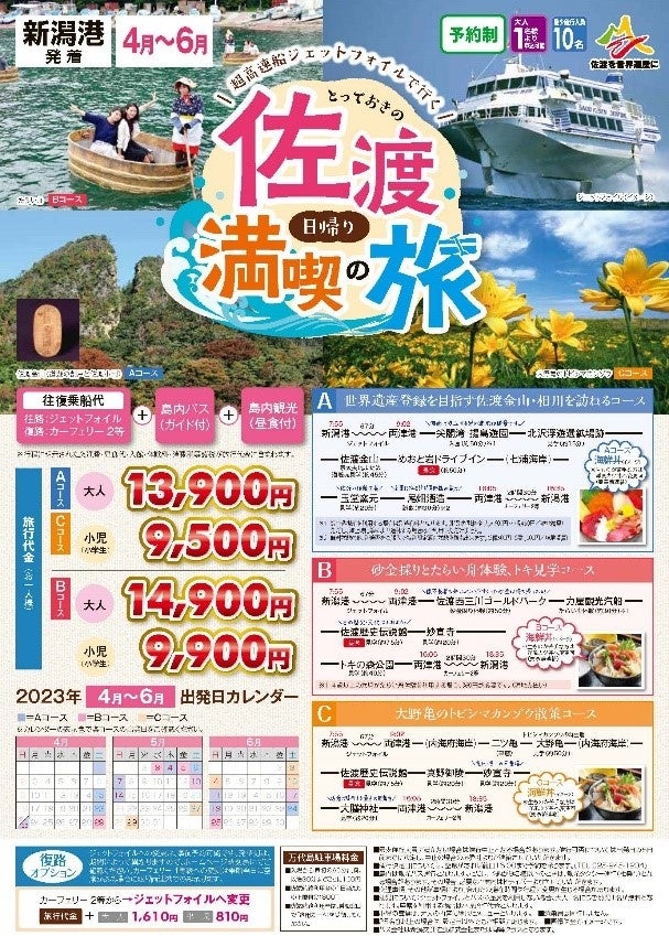 佐渡汽船は、新潟港発着の日帰りツアー「とっておきの佐渡日帰り満喫の旅(4~6月)」の発売を開始いたしました。