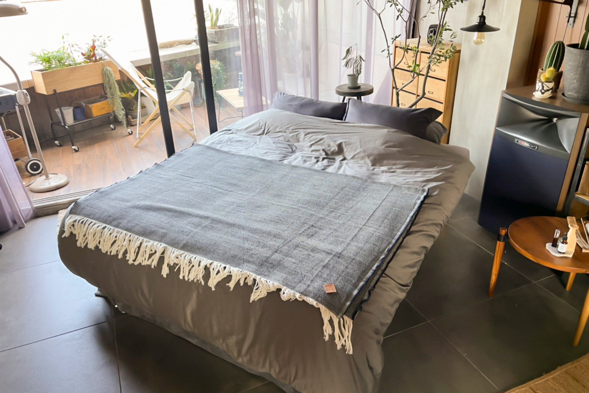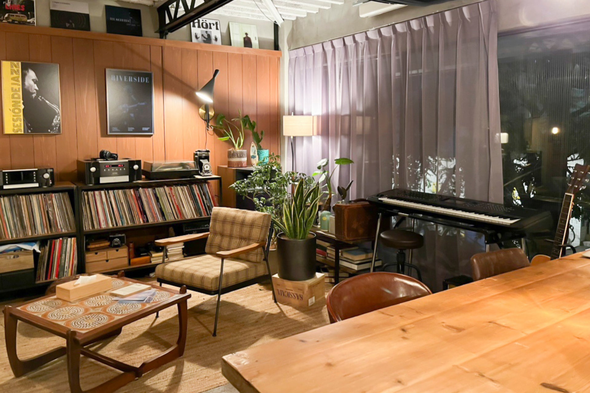 一方、寛の部屋は、音楽とともに過ごす大人の空間。レコードや楽器に囲まれた中で、ベッドエリアのブランケットや柔らかな光を放つフロアランプが、落ち着きと温もりを添えています。