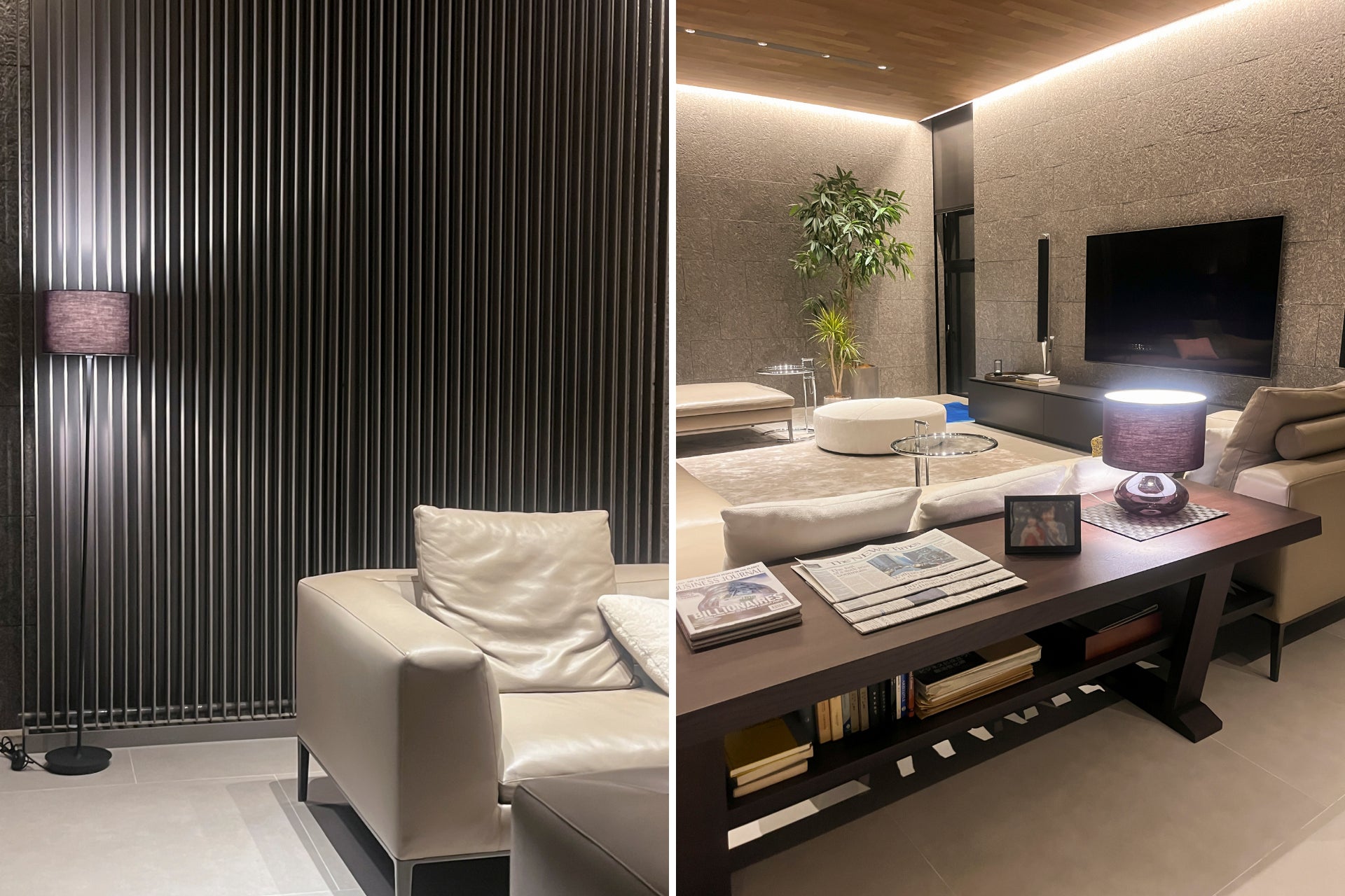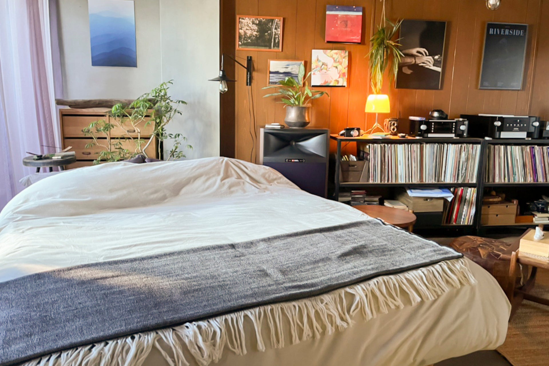 主人公の部屋は、音楽とともに過ごす大人の空間。レコードや楽器に囲まれた中で、ベッドエリアのブランケットや柔らかな光を放つフロアランプが、落ち着きと温もりを添えています。