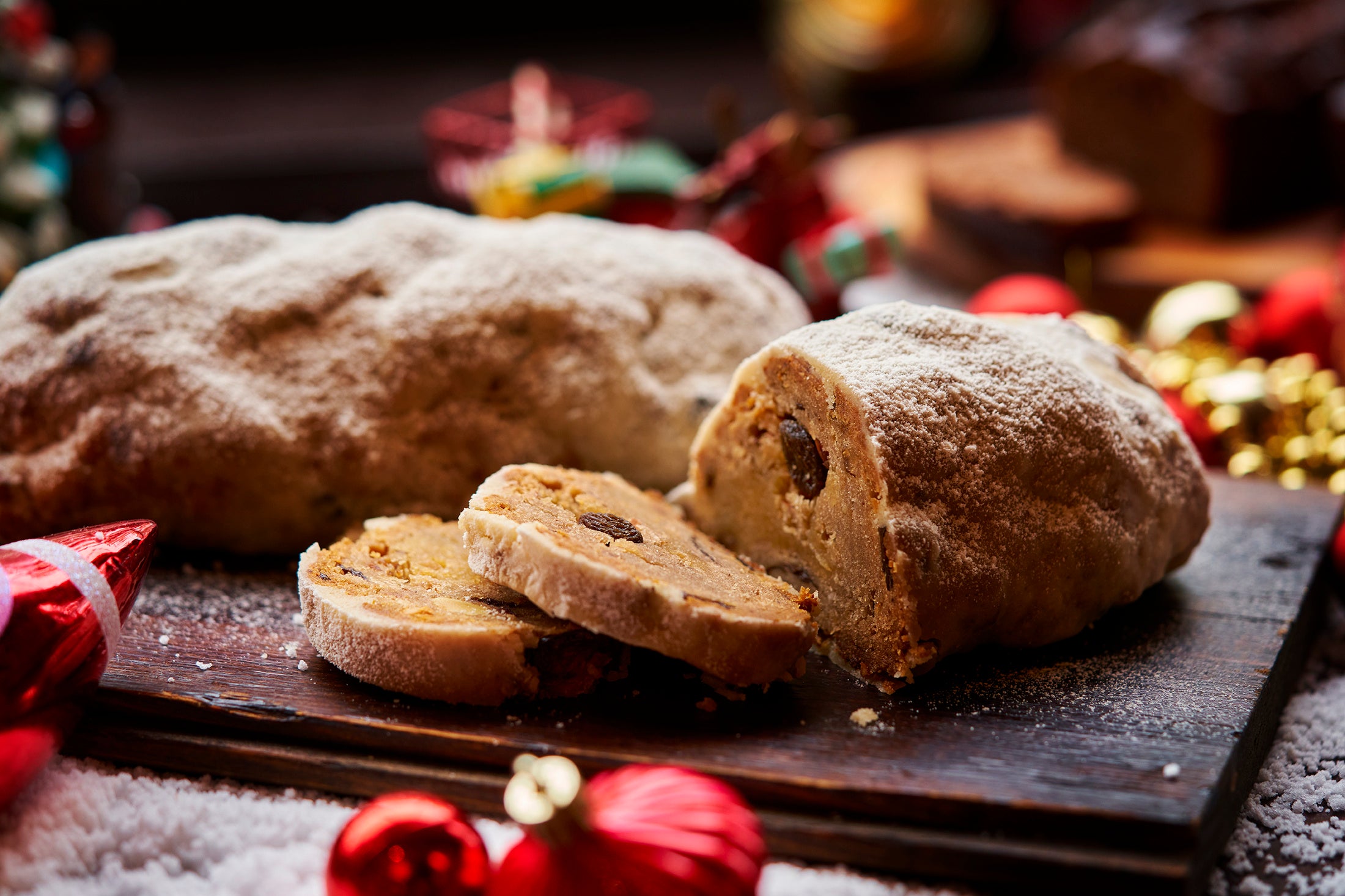 有機小麦を使用した生地に、たっぷりのナッツやドライフルーツを詰め込んだ、伝統的なクリスマス菓子、シュトーレンです。