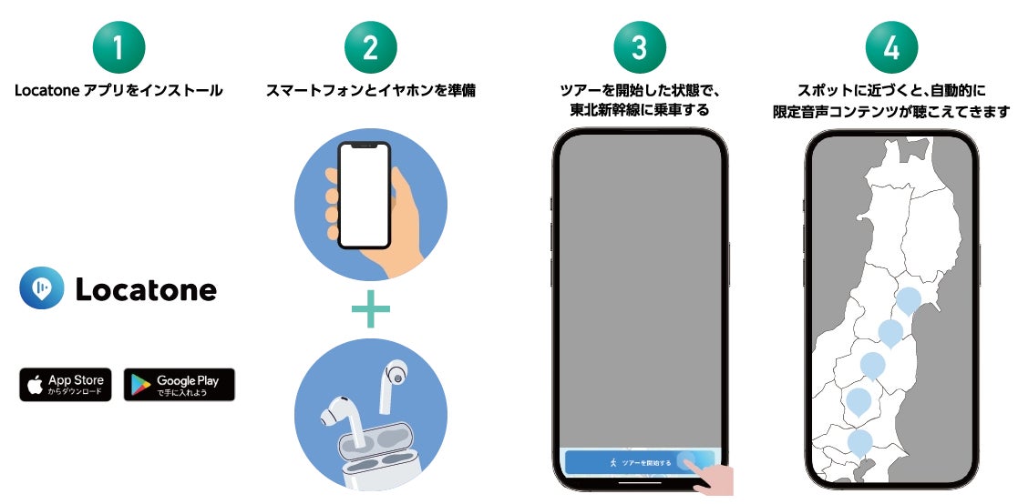 スマートフォンにLocatoneアプリをインストールし、「呪術廻戦×JR東日本 -東日本回游-」ツアーを開始した状態で首都圏エリア・東北新幹線大宮~仙台間・仙台エリアの各スポットを回遊すると、GPS連動により自動的に音声コンテンツが再生されます。TVアニメ『呪術廻戦』のキャラクターによる、特別な音声体験をお楽しみいただけます。