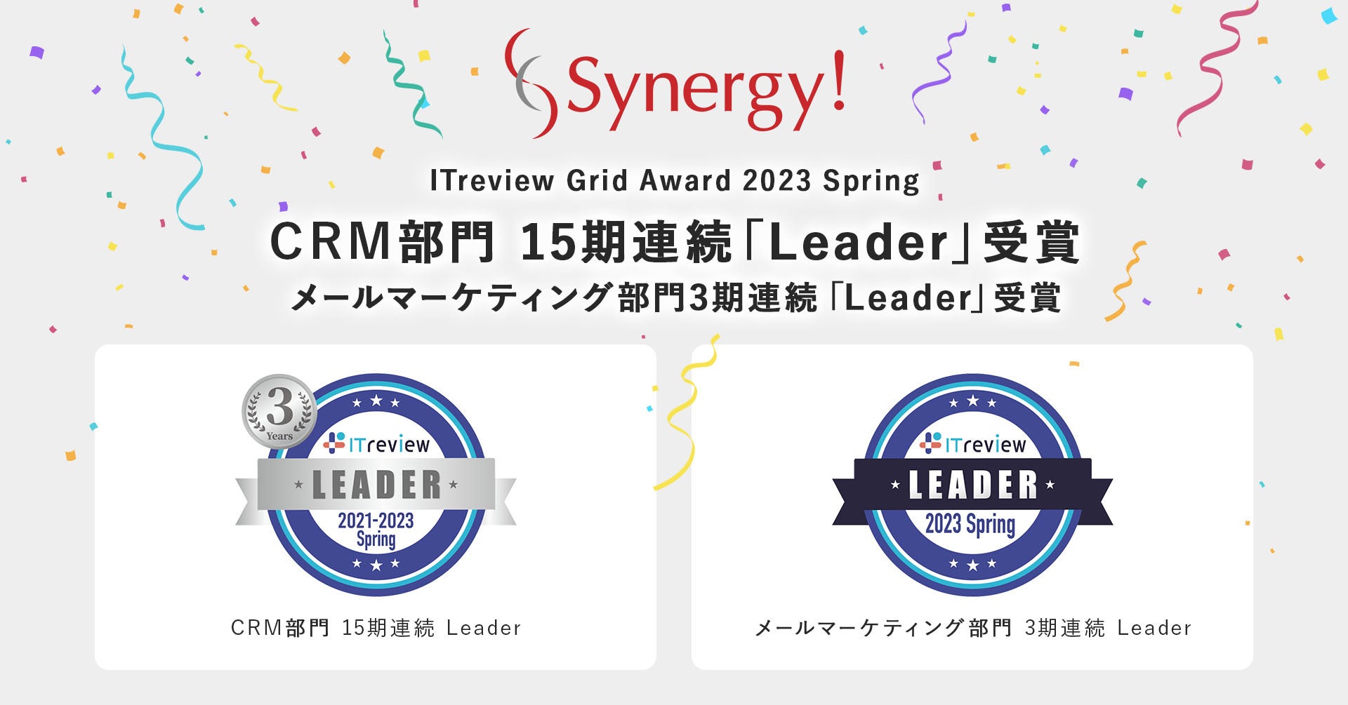 「Synergy!」が「ITreview Grid Award 2023 Spring」 CRMとメールマーケティング部門で最高位「Leader」受賞、CRM部門は15期連続「Leader」受賞