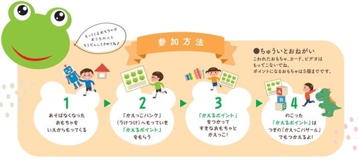 使わなくなったおもちゃを会場へ持っていくと、「かえるポイント」を貯めることができ、この「かえるポイント」を使って、会場内の好きなおもちゃと交換可能。当日おもちゃを持っていない方でも、会場の飾りつけのお手伝いとしてぬり絵に参加することで「かえるポイント」を貯めておもちゃと交換できます。当施設を皮切りに、みなとみらい東急スクエア、武蔵小杉東急スクエア、港北 TOKYU S.C.の計4施設で開催予定です