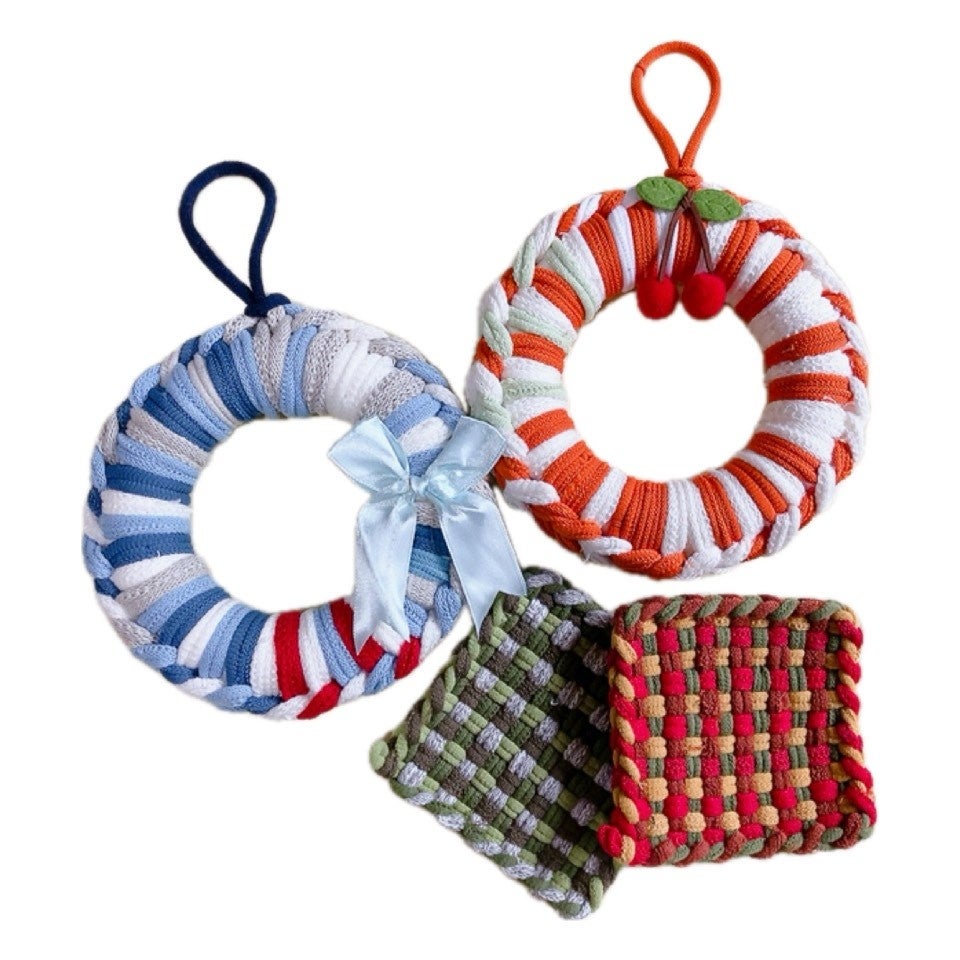 靴下の製造過程で生まれたカラフルな端切れを編んで、リースやコースターを作るワークショップを開催。端切れの詰め放題も実施します