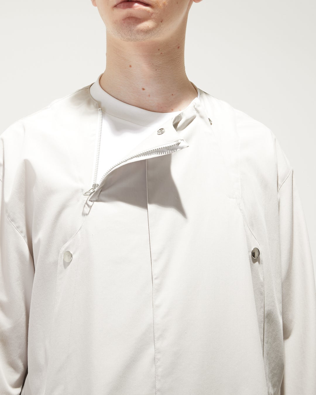 台衿付きシャツカラーは取り外し可能で、よりアウターとしての性質を 強く出すことも可能。