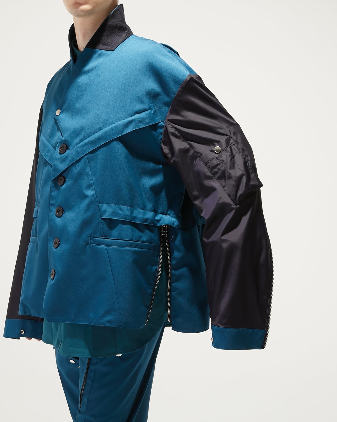 フライトスーツのパンツ部分のディテールを上身頃に落とし込むことで、よりアイテム同士の構造のMIX感を強く形成したアイテムです。