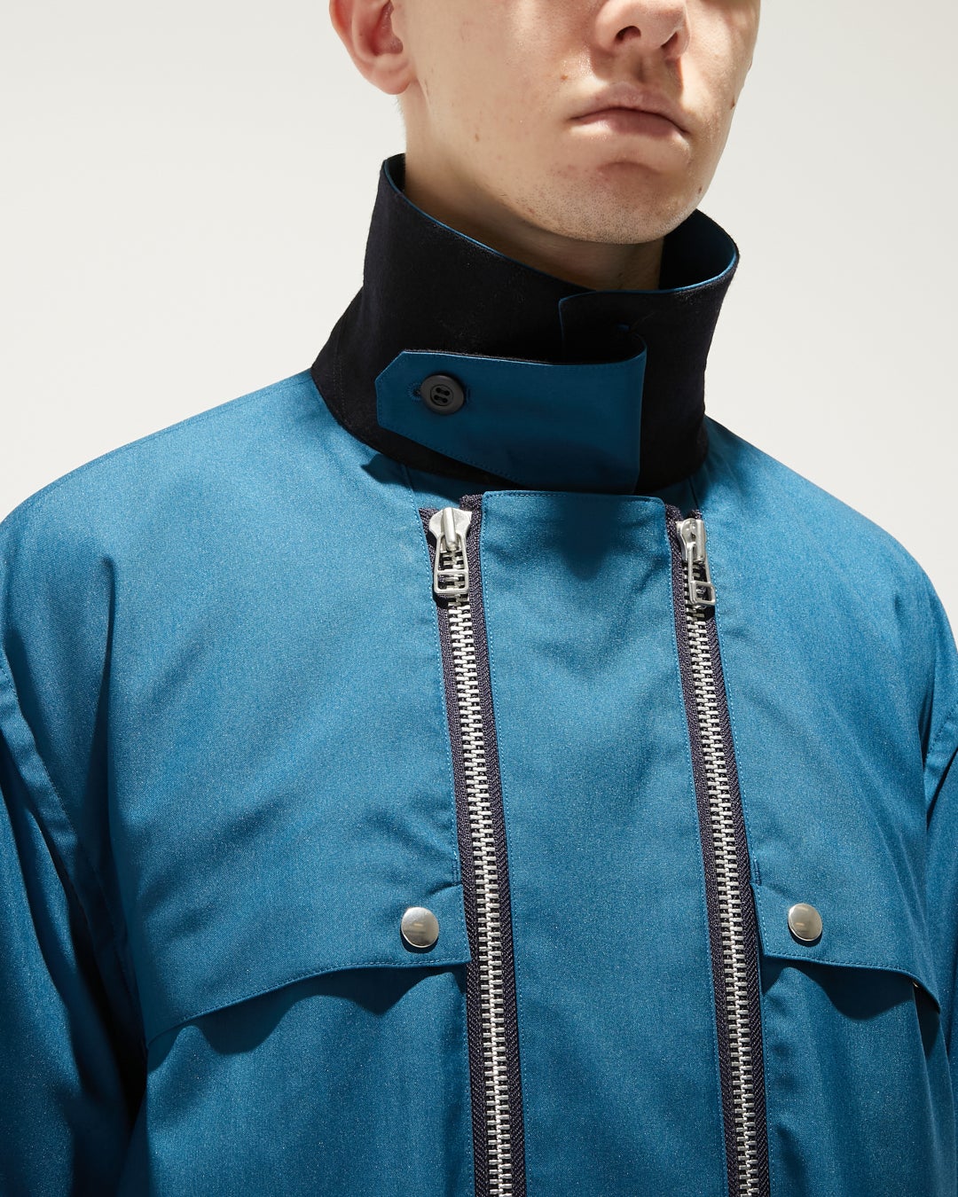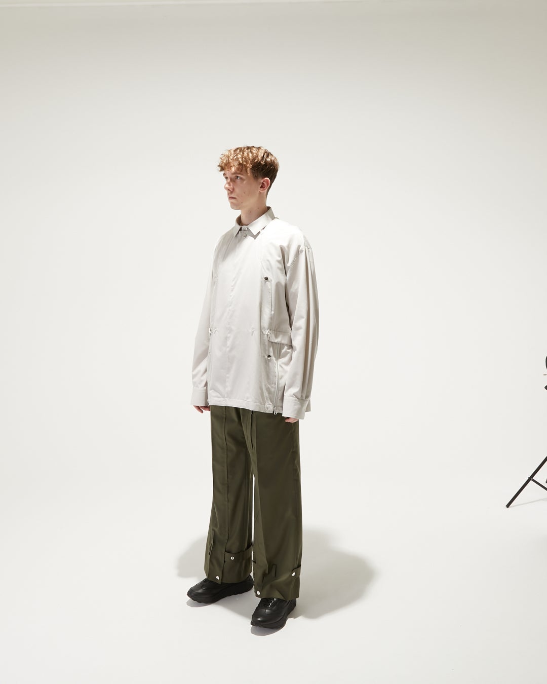 軽い素材、シャツのディテールとミリタリーのディテール、ブルゾンとしての構造で、軽と重の性質の対比を共存させたアイテムです。