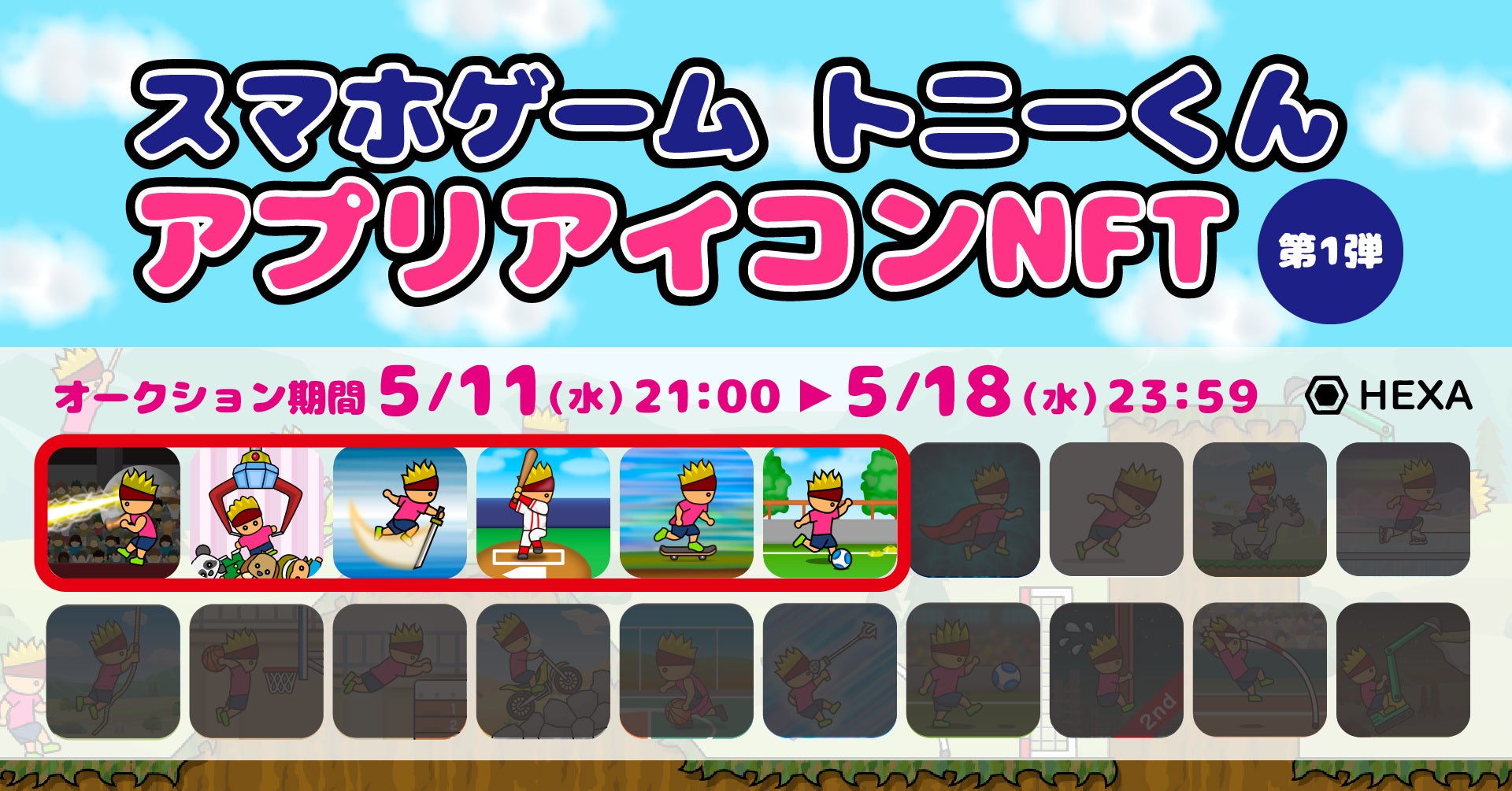 NFTマーケット「HEXA(ヘキサ)」では、スマホゲームアプリ「トニーくん」シリーズのアプリアイコンをNFT化して5/11(水)21時からオークション形式で販売します。