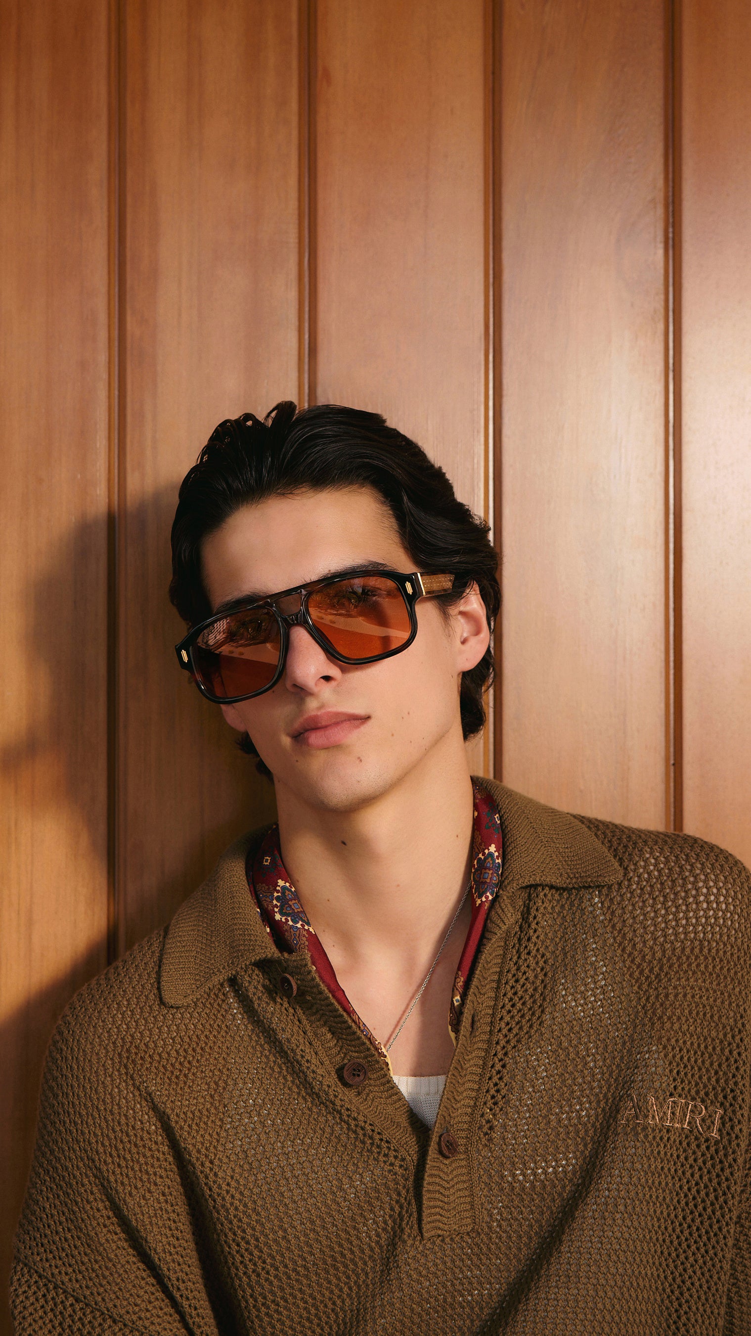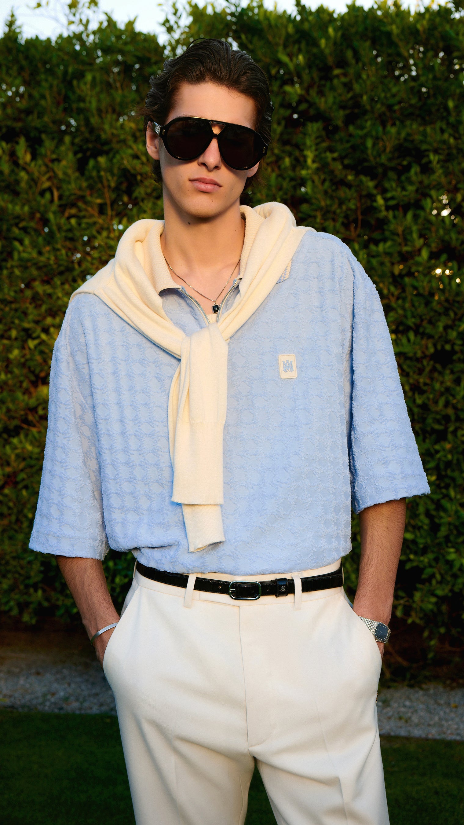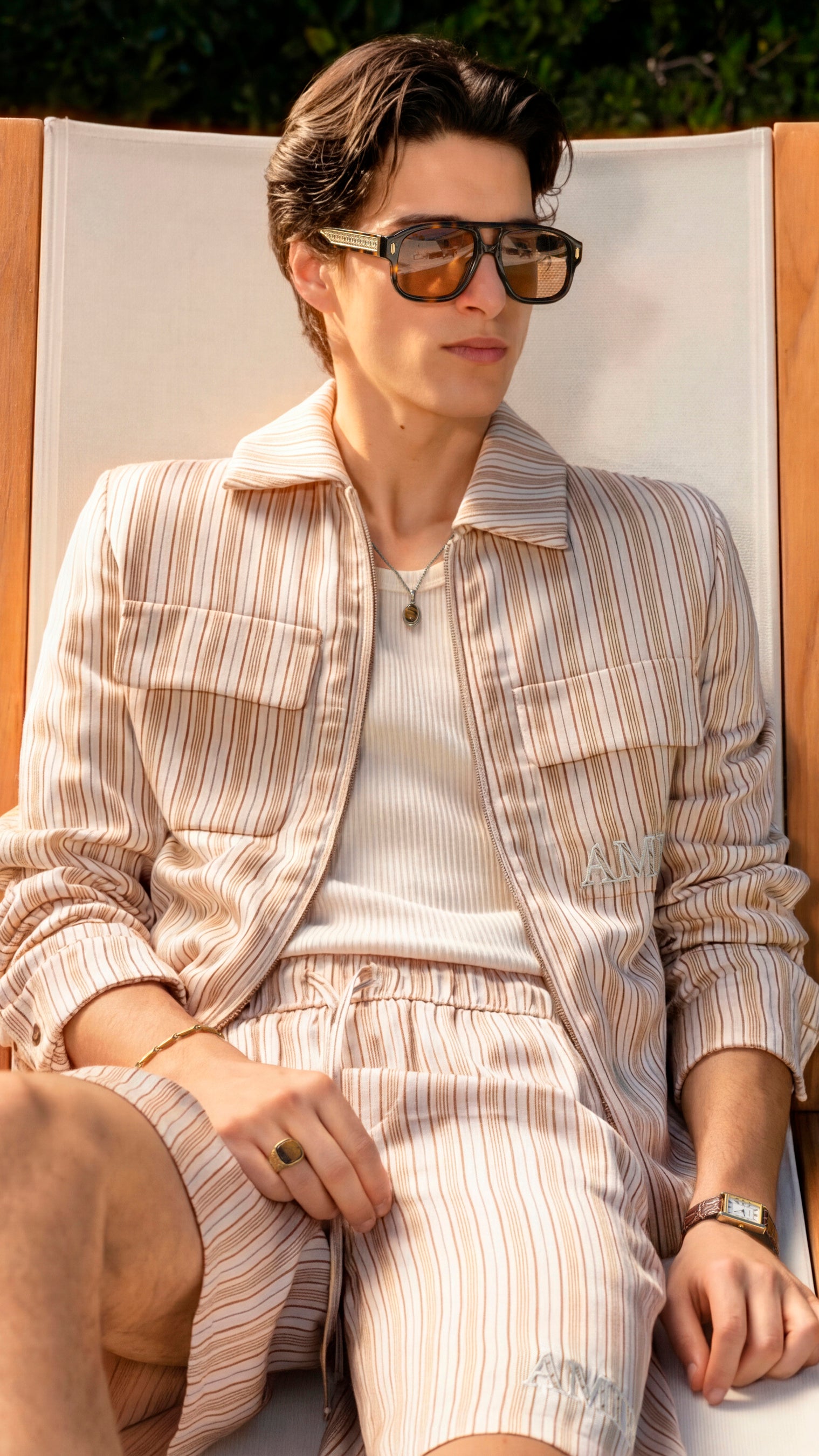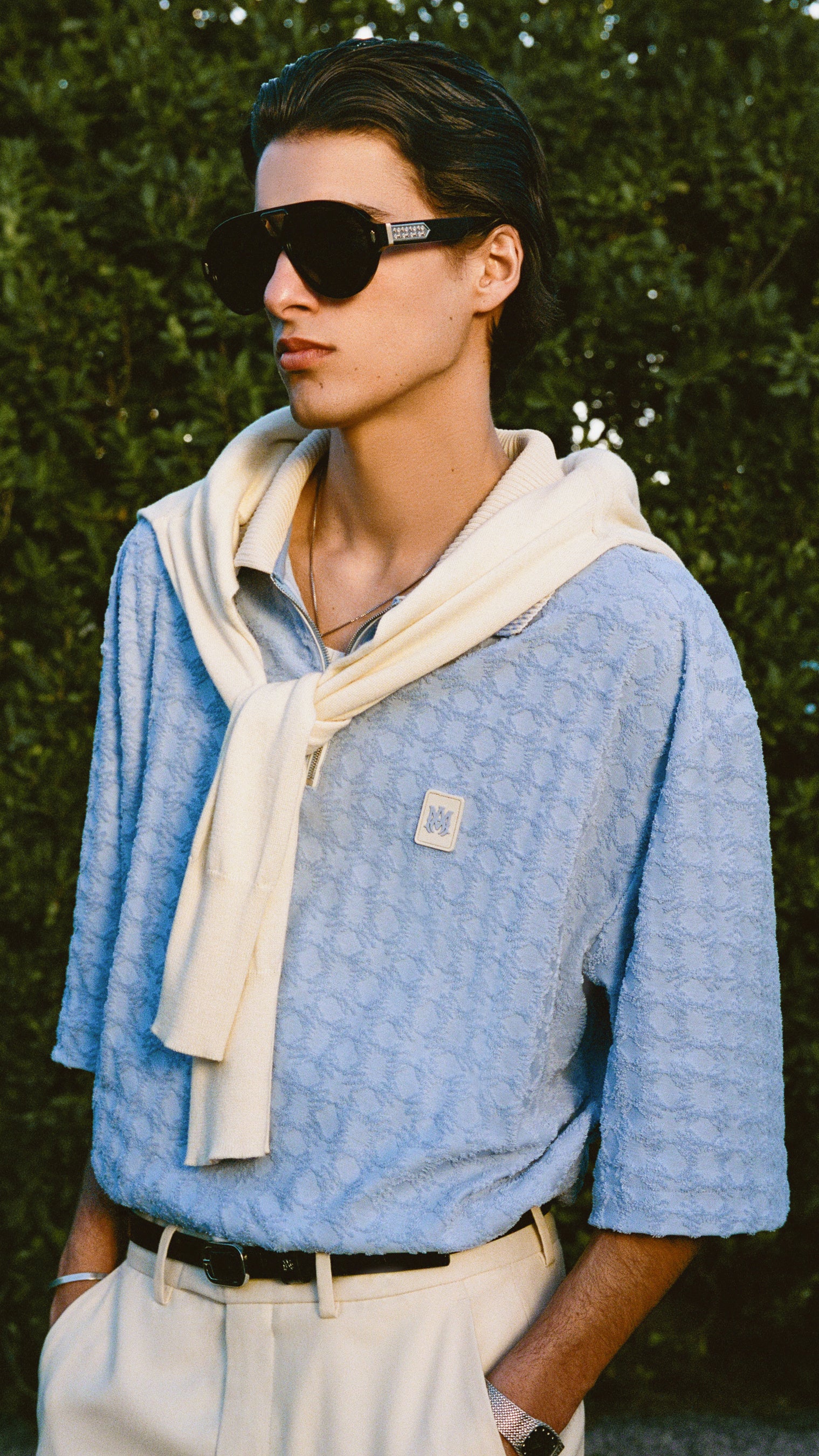 伝説的なパームスプリングスのホテルを彩るストライプ柄の装飾が繊細なストライプディテールとして反映され、柔らかなテリークロスにMAモノグラムが織り込まれます。シルエットはボディラインにフィットしたデザインで、スリムなハイウエストパンツ、細身のニットシャツやドレスが揃います。さらにゴルフ、テニス、プールサイドといった、ノスタルジックなレジャーシーンから着想を得たレトロな要素が取り入れられています。これらのすべてのルックは、ゴールドのディテールをあしらった洗練されたアビエータースタイルのアミリの象徴的な「サンセット・サングラス」によって完成します。