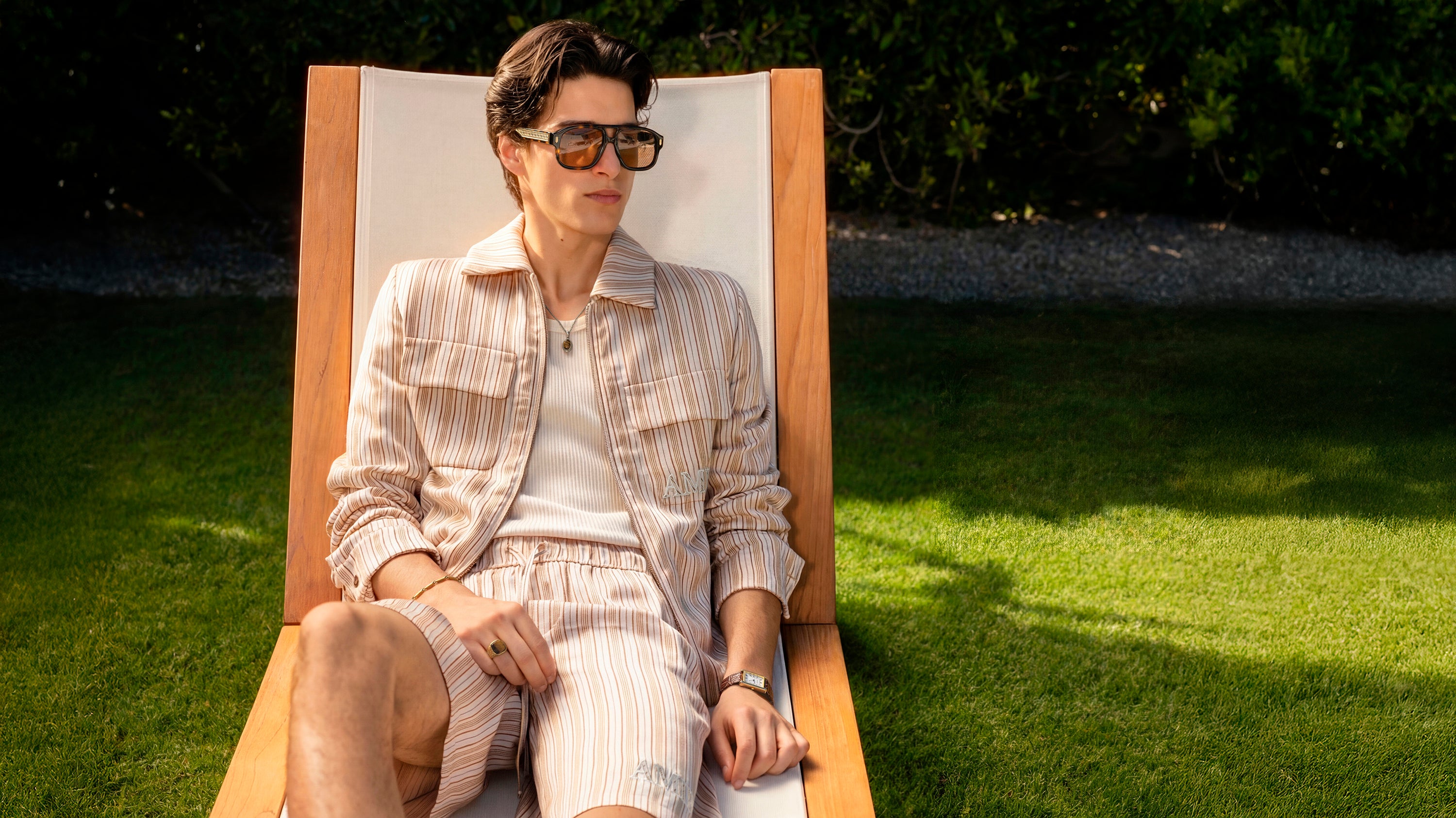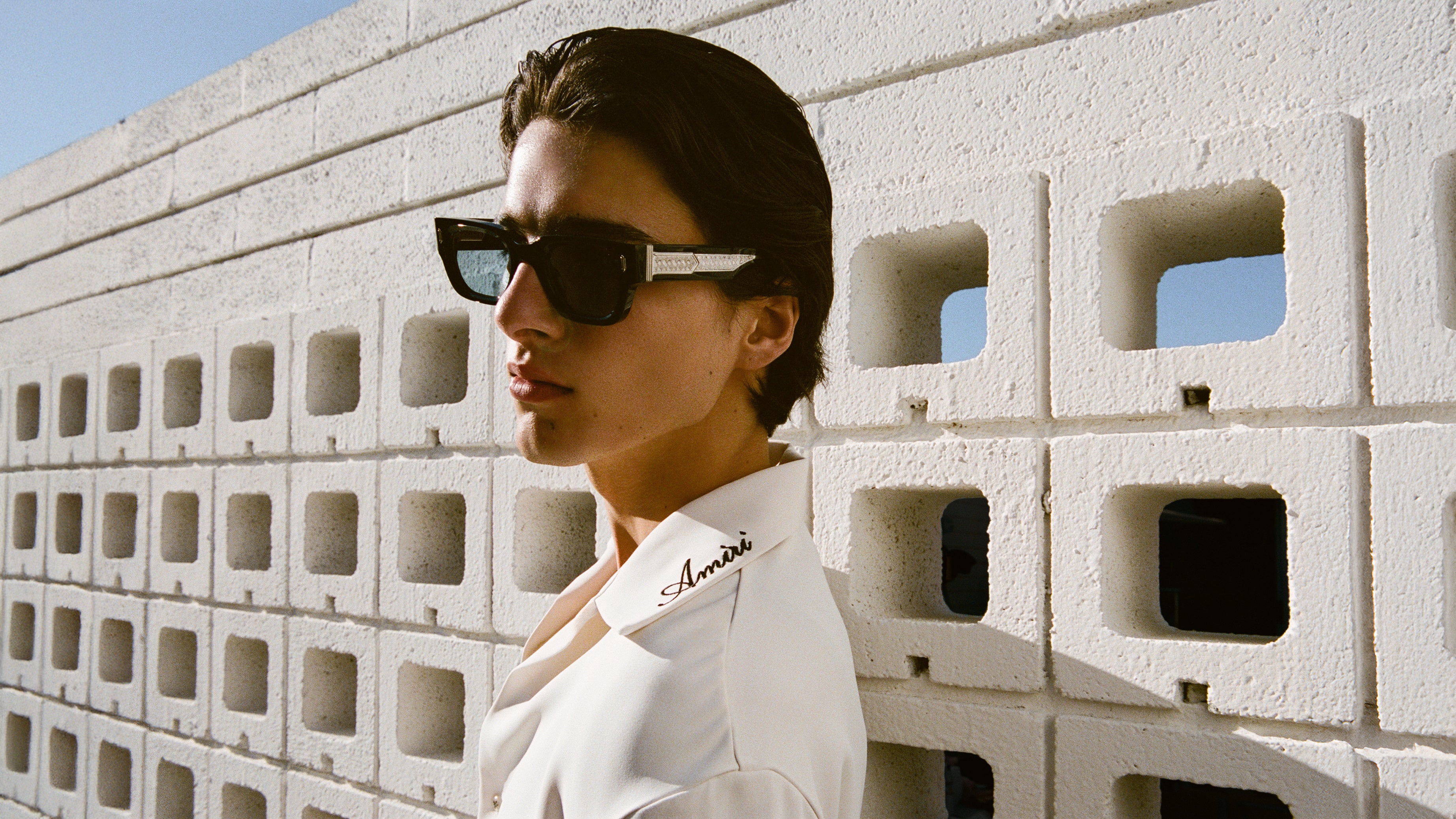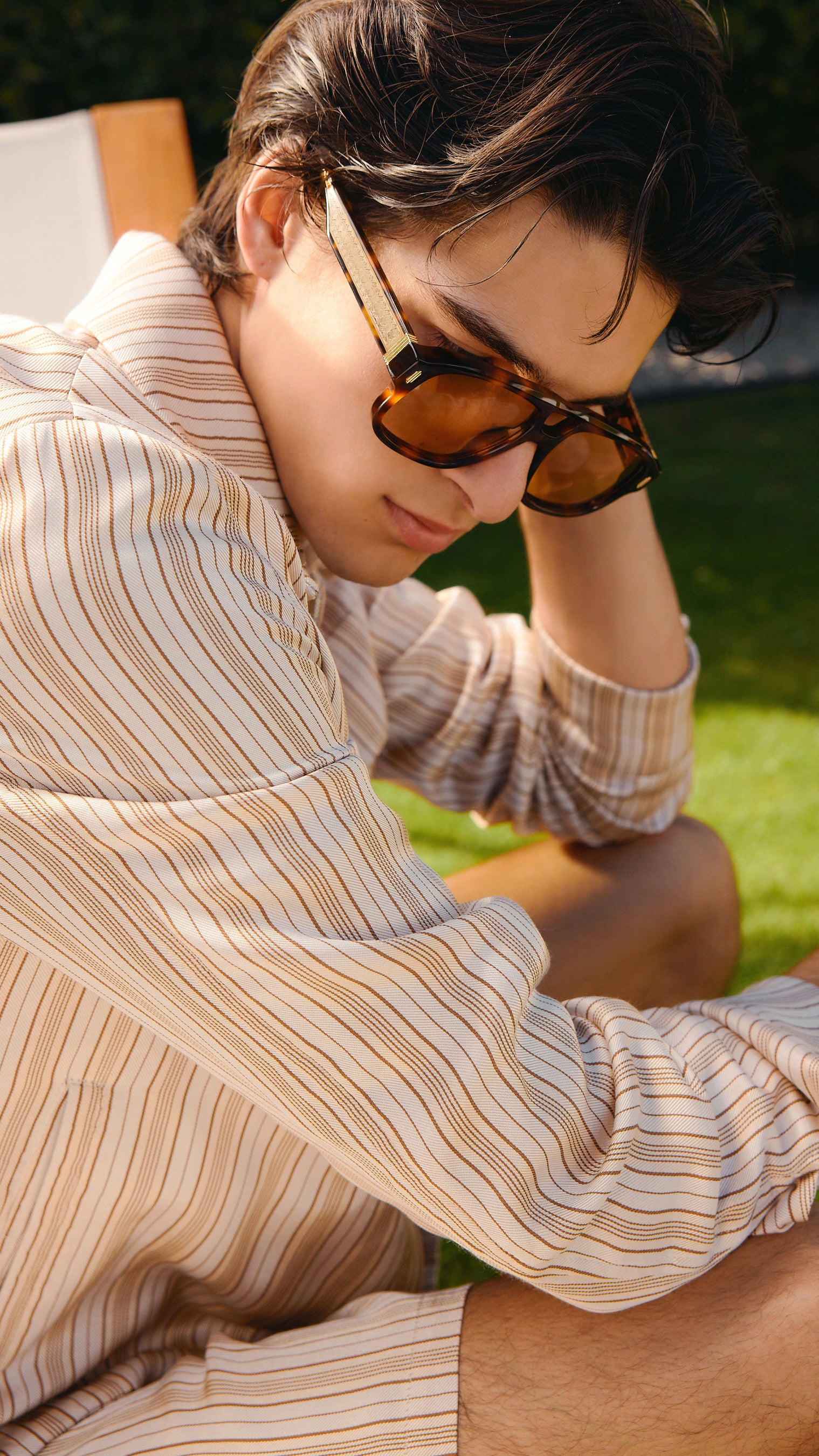 伝説的なパームスプリングスのホテルを彩るストライプ柄の装飾が繊細なストライプディテールとして反映され、柔らかなテリークロスにMAモノグラムが織り込まれます。シルエットはボディラインにフィットしたデザインで、スリムなハイウエストパンツ、細身のニットシャツやドレスが揃います。さらにゴルフ、テニス、プールサイドといった、ノスタルジックなレジャーシーンから着想を得たレトロな要素が取り入れられています。これらのすべてのルックは、ゴールドのディテールをあしらった洗練されたアビエータースタイルのアミリの象徴的な「サンセット・サングラス」によって完成します。