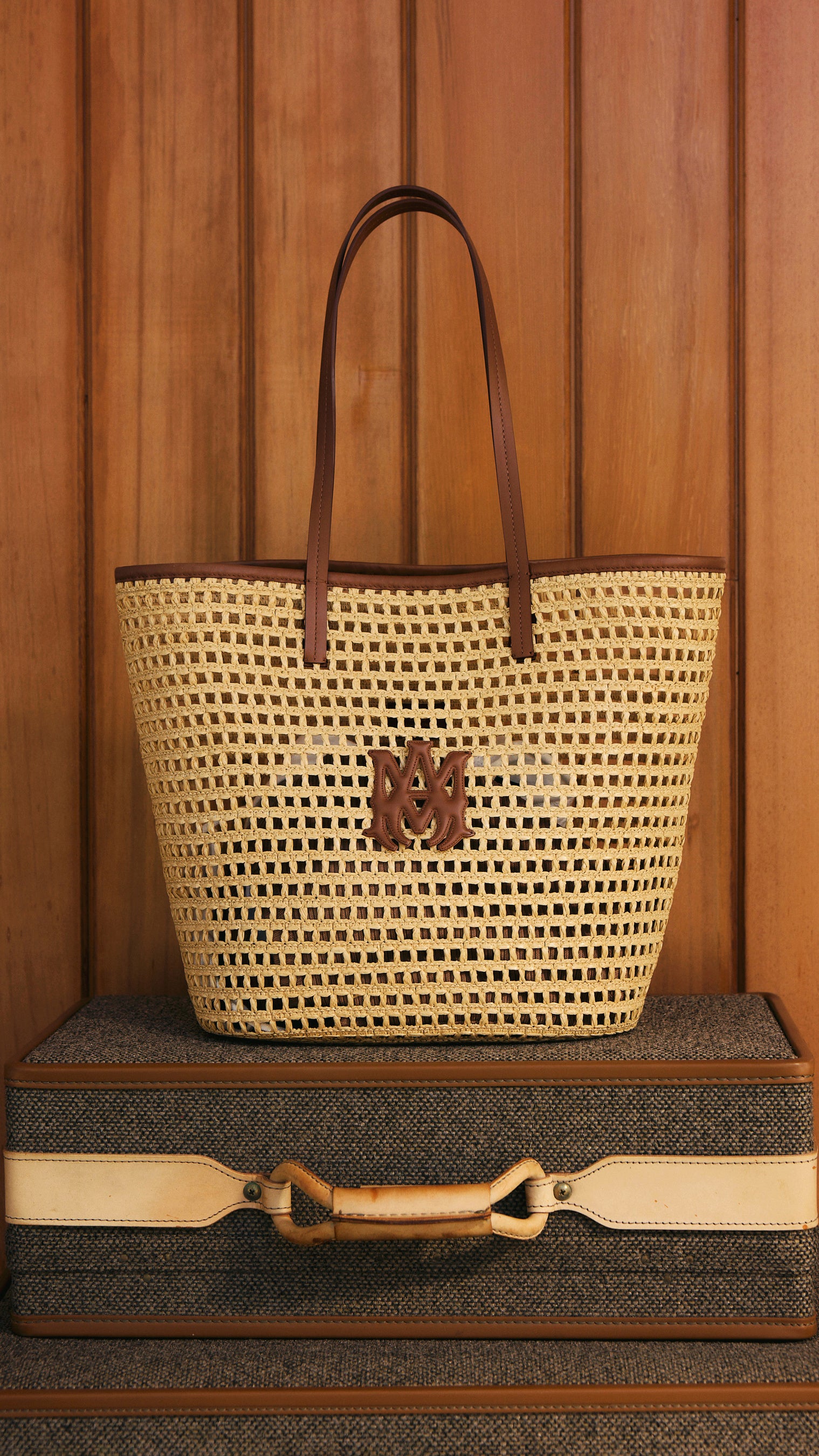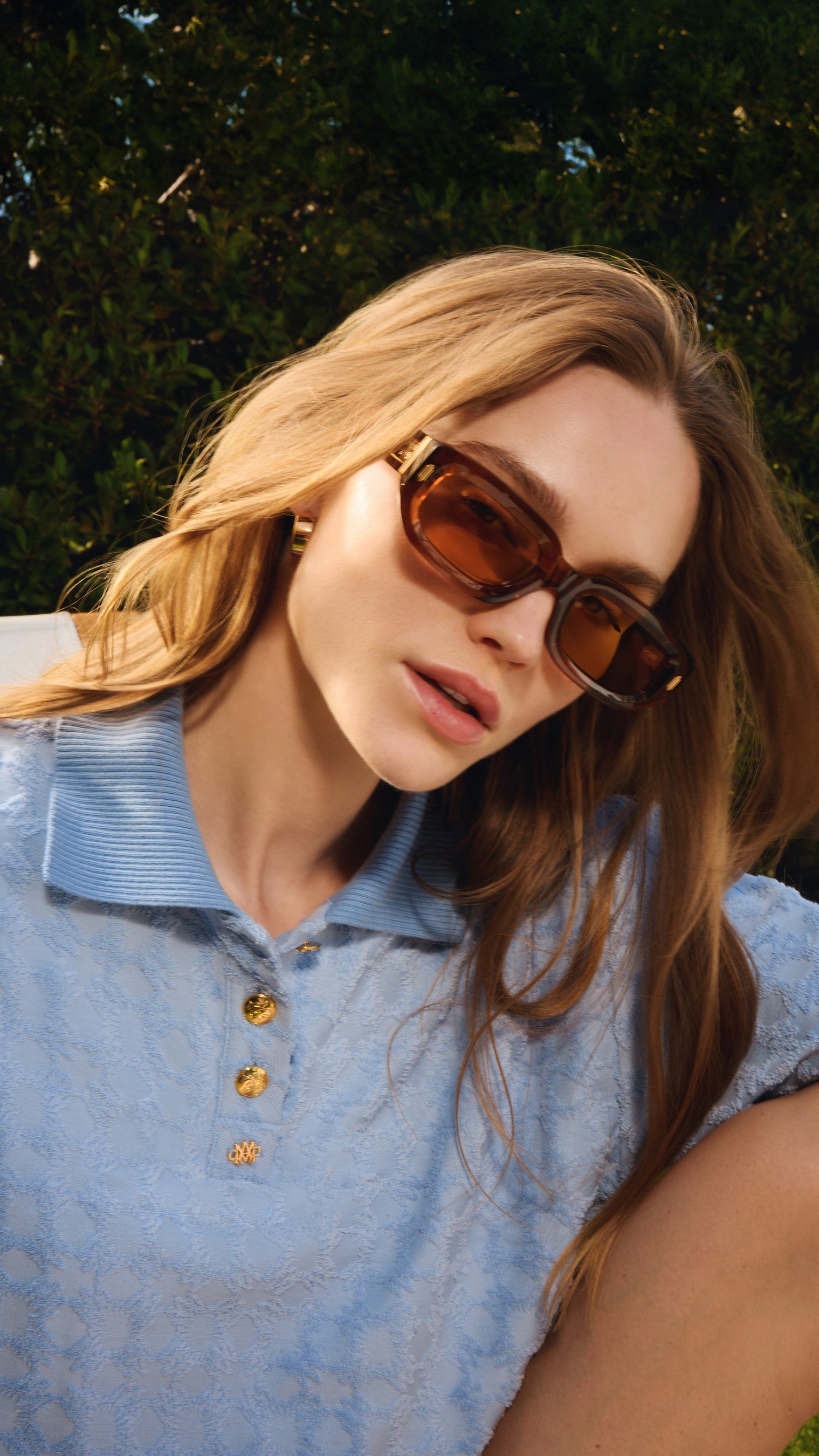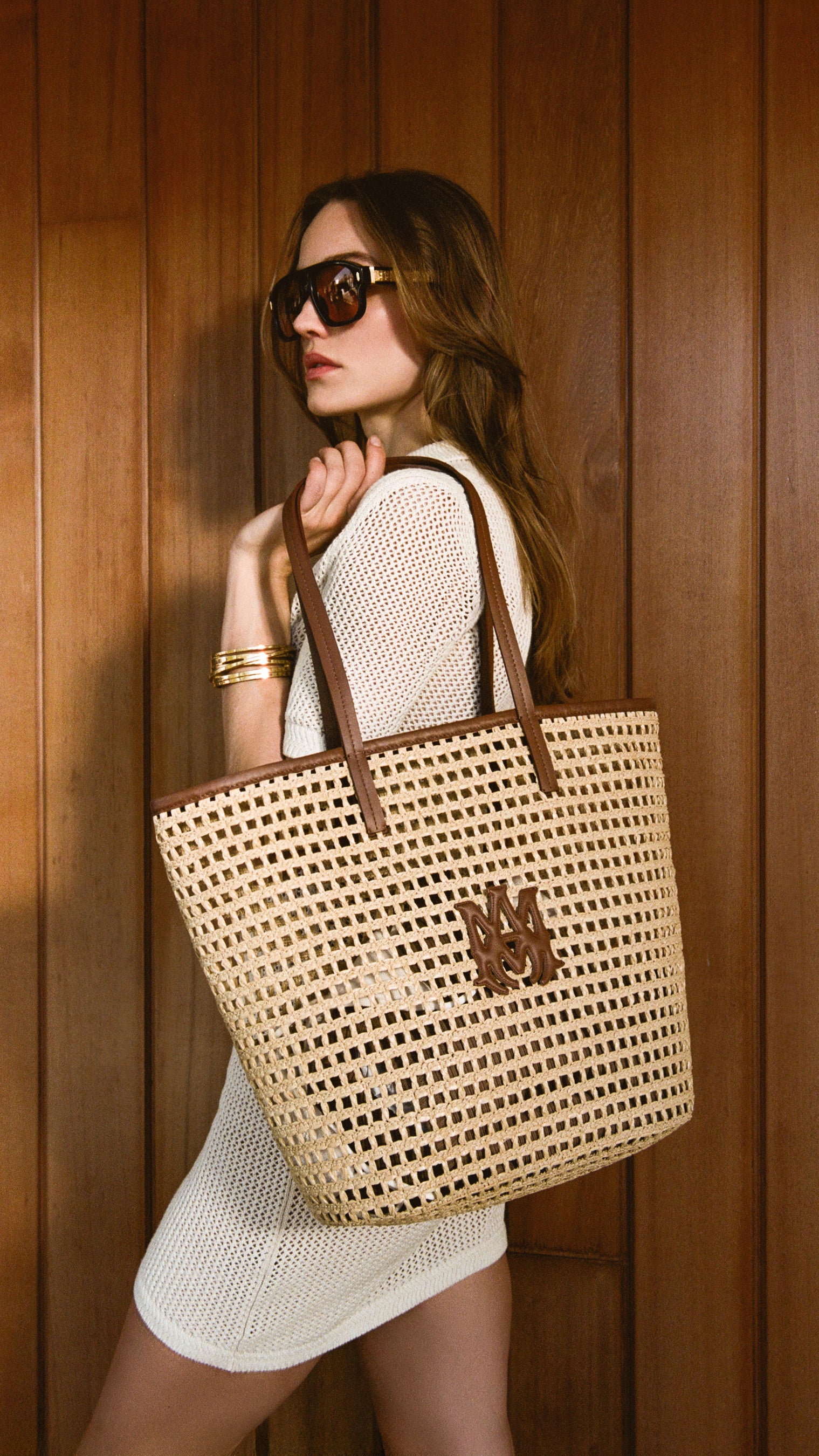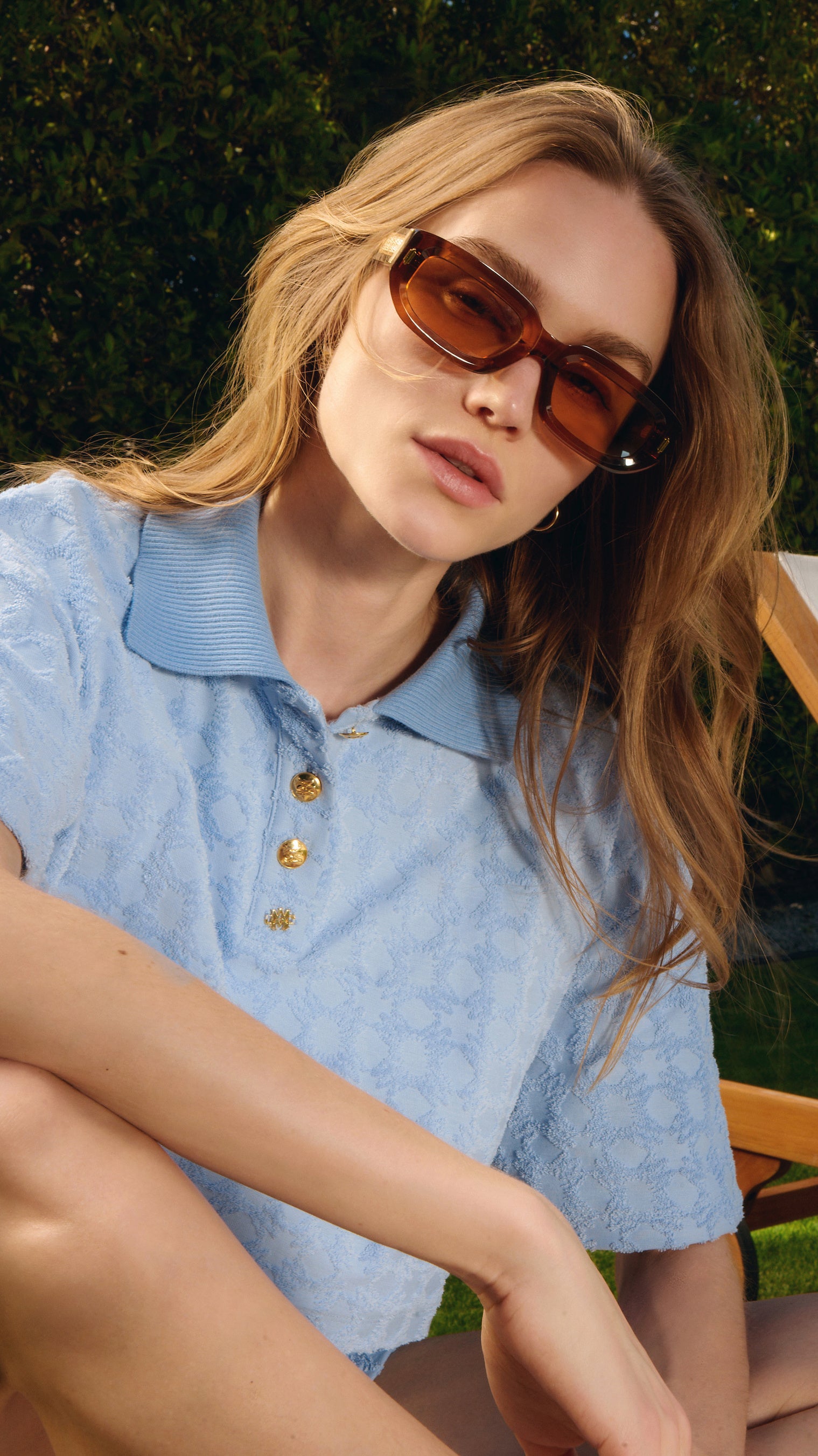 伝説的なパームスプリングスのホテルを彩るストライプ柄の装飾が繊細なストライプディテールとして反映され、柔らかなテリークロスにMAモノグラムが織り込まれます。シルエットはボディラインにフィットしたデザインで、スリムなハイウエストパンツ、細身のニットシャツやドレスが揃います。さらにゴルフ、テニス、プールサイドといった、ノスタルジックなレジャーシーンから着想を得たレトロな要素が取り入れられています。これらのすべてのルックは、ゴールドのディテールをあしらった洗練されたアビエータースタイルのアミリの象徴的な「サンセット・サングラス」によって完成します。