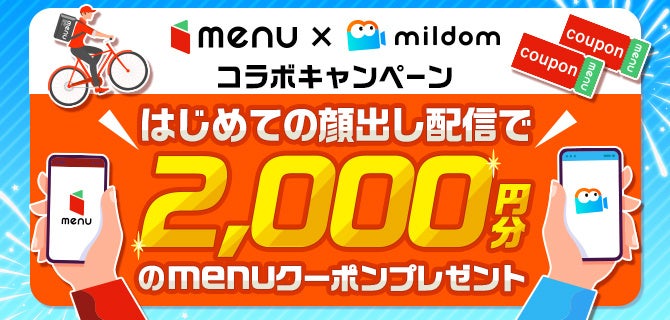 【キャンペーン内容】キャンペーン期間中、「Mildom」で初めての顔出し配信を15分以上連続して行ったユーザーに、2,000円分のmenuクーポンをプレゼントいたします。