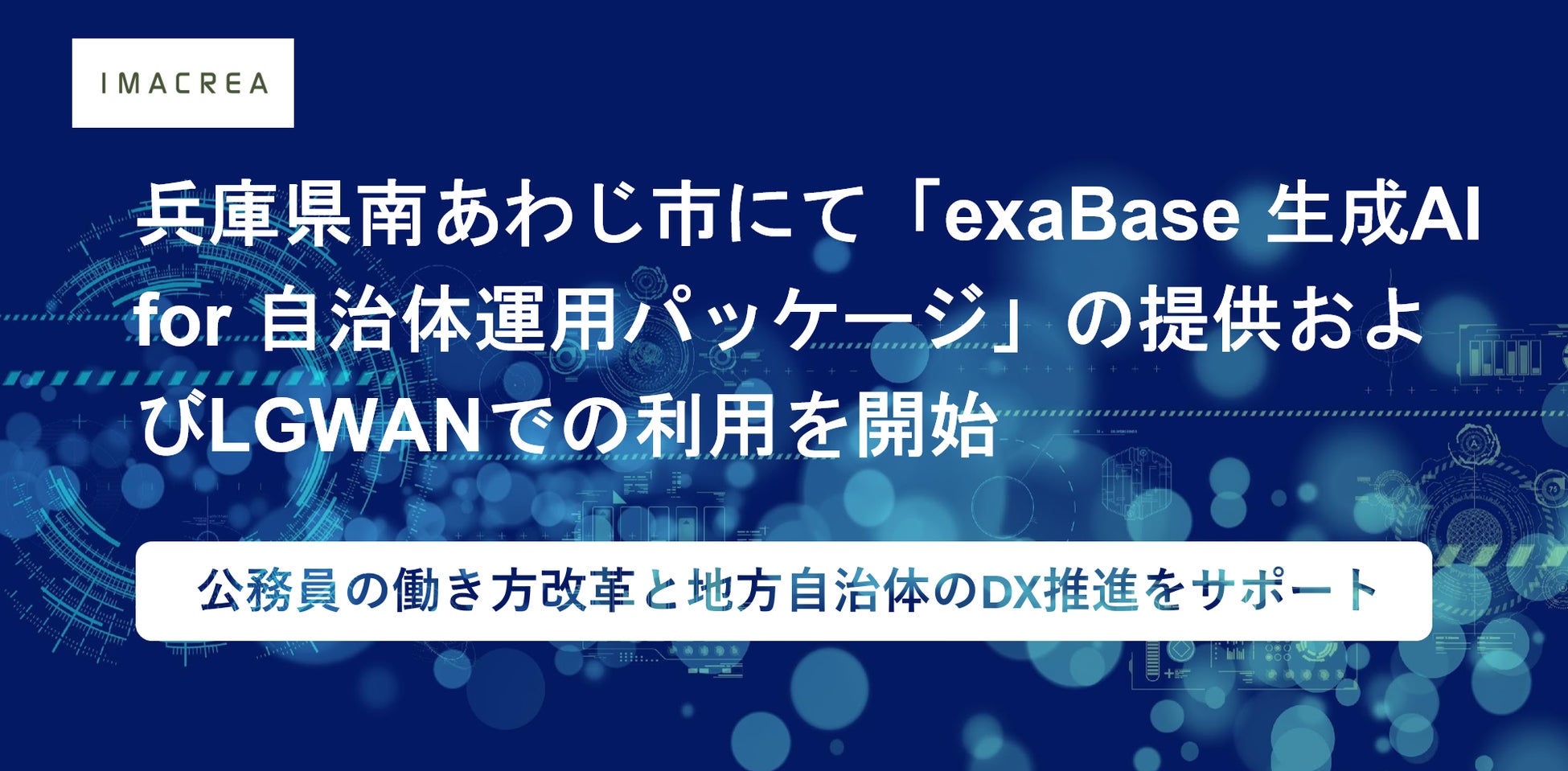 株式会社イマクリエ(本社:東京都港区、代表取締役:鈴⽊信吾、以下、当社)は、兵庫県南あわじ市に「exaBase 生成AI for 自治体運用パッケージ」の提供を開始したことをお知らせします。