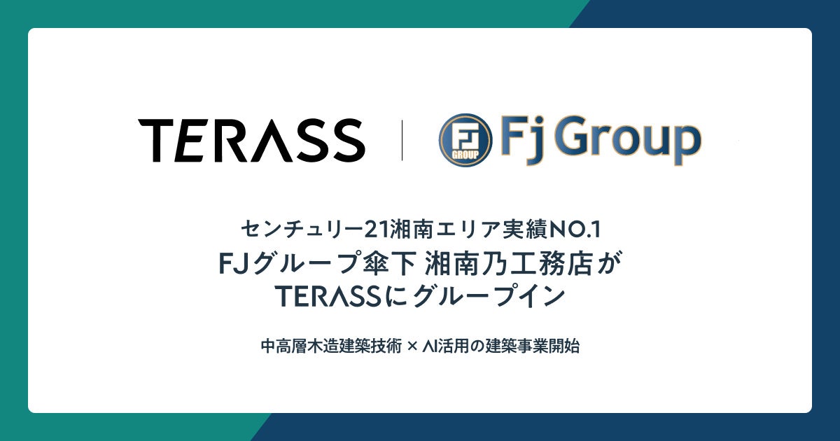 不動産仲介関連サービスを提供する株式会社 TERASS(東京都港区、代表取締役:江⼝亮介、以下「TERASS」)は、センチュリー21加盟店として不動産・建築事業を営むFJグループの富士リアルティ株式会社(神奈川県藤沢市、代表取締役:永松秀行、以下「富士リアルティ」)の子会社である湘南乃工務店株式会社(所在地・代表者は富士リアルティと同じ、以下「湘南乃工務店」)の全株式を取得しグループ会社化いたしましたので、お知らせいたします。