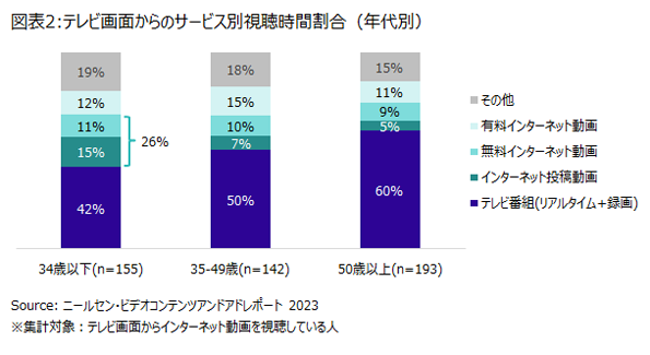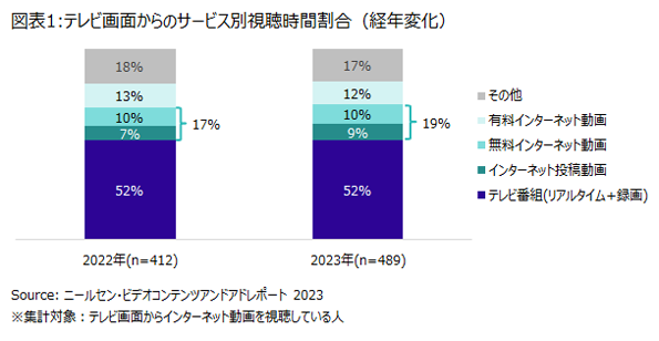 「ニールセン・ビデオコンテンツ アンド アドレポート 2023(Nielsen Video Contents & Ads Report 2023)」によると、テレビ画面からインターネット動画を視聴する人のサービス別視聴時間割合を経年比較すると、インターネット投稿動画と無料インターネット動画を合計した広告型インターネット動画の視聴時間割合が今年は19%で、昨年の17%と比較し2ポイント増加していました(図表1)。