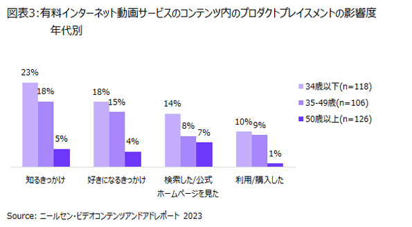 また、マーケティング担当者は、通常の広告を出稿することができない有料インターネット動画サービスの視聴に費やされている時間を無視しても良いのでしょうか。実際には、若年層ほど有料インターネット動画サービスの利用率が高く、今後契約数を増やしたいと思っている人が多くなっています。そのため、有料インターネット動画に費やされる時間が、特に若年層において今後増えていく可能性も考えられるため、ここに費やされる時間の活用も検討する必要があります。有料インターネット動画を消費者とのコミュニケーションに活用する方法の一例として、動画コンテンツ内に衣装や小道具などとして商品やサービスを登場させるプロダクトプレイスメントがあります。この手法は古くより、映画やテレビ番組において用いられてきましたが、近年ではインターネット動画サービス上のコンテンツにおいても活用されています。広告などの情報の受け止め方は年代によって異なるため、その影響度を把握した上で活用していくことが重要です。実際に、プロダクトプレイスメントの影響度を年代別に見ると、「商品やサービスを知る/好きになるきっかけ」や、「商品やサービスを検索した/公式ホームページを見た」、「利用/購入」につながる割合が、若年層ほど高くなっています(図表3)。広告型インターネット動画サービスだけでなく、有料インターネット動画サービスも併せて活用していくことで、若年層と効果的にコミュニケーションを取ることができると考えられます。