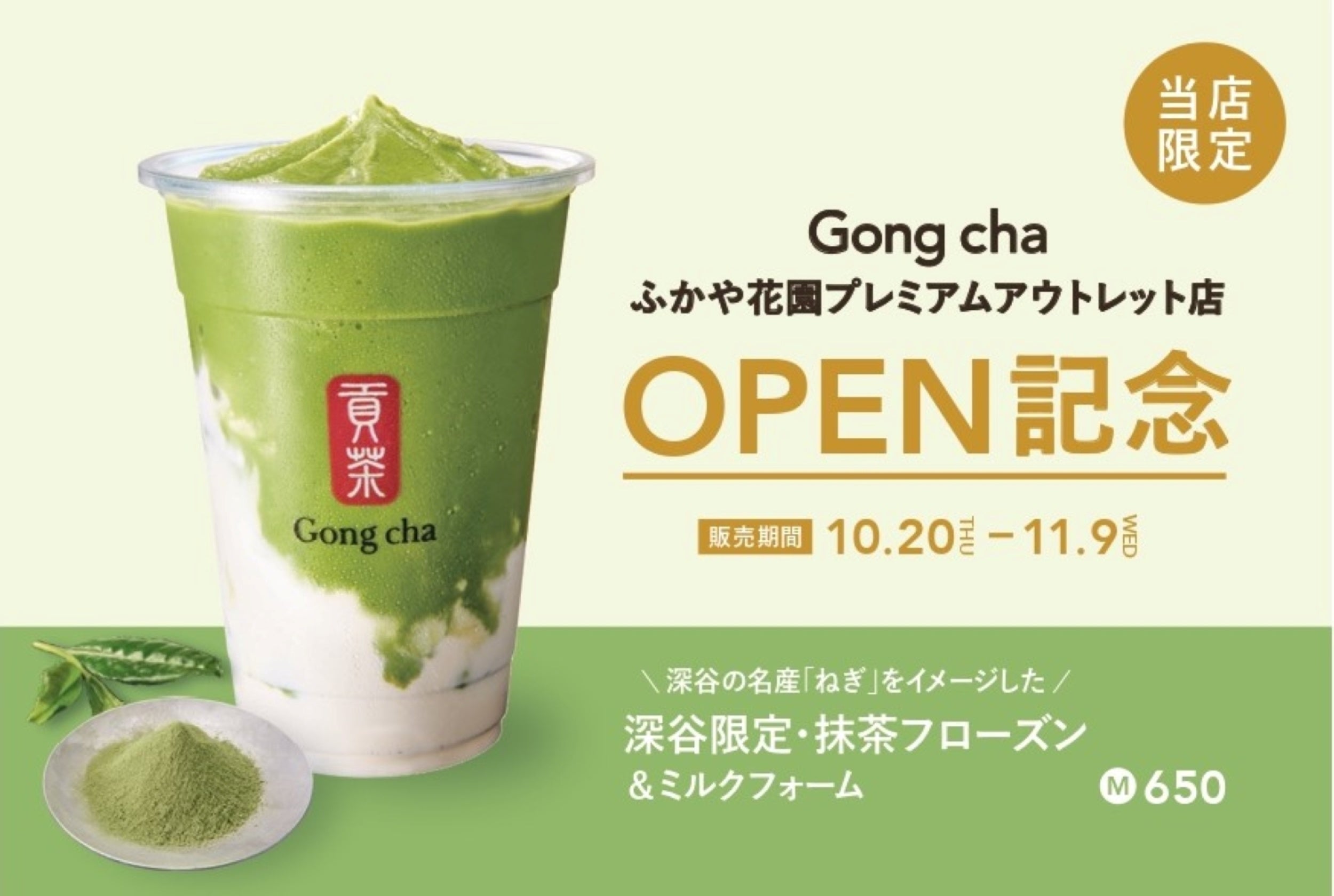 なお、「ゴンチャ ふかや花園プレミアム・アウトレット店」グランドオープンを記念して、同店のみで販売する限定メニュー「深谷限定・抹茶フローズン&ミルクフォーム」をご用意いたしました。香り高く味わい深い抹茶フローズンティーにミルクフォームを加え、同店を構える深谷市の特産物“深谷ねぎ”をイメージしたビジュアルに仕立てています。ちょっと遊び心ある「深谷限定・抹茶フローズン&ミルクフォーム」をお召し上がりいただけるのは、10月20日(木)からのオープ二ング期間のみです。ぜひこの機会に、「ゴンチャ ふかや花園プレミアム・アウトレット店」にご来店ください。