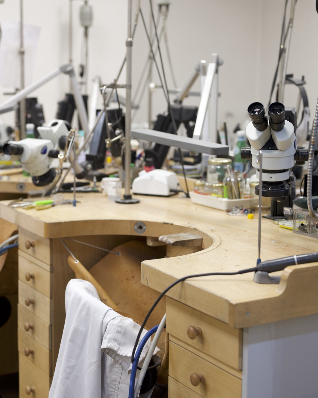 ブロンドー(Blondeau)、ベルター(Belter)、シャンソン(Chanson)、FGデブロプマン(FG Développement)の4社から構成されるこの工房は、2017年より一つの拠点に集結し、各工程に携わる約60人の職人(CADデザイナー、宝石職人、宝石細工職人、セッティング職人、研磨職人)が共同作業を行い、ハイジュエリーの制作に携わっています。