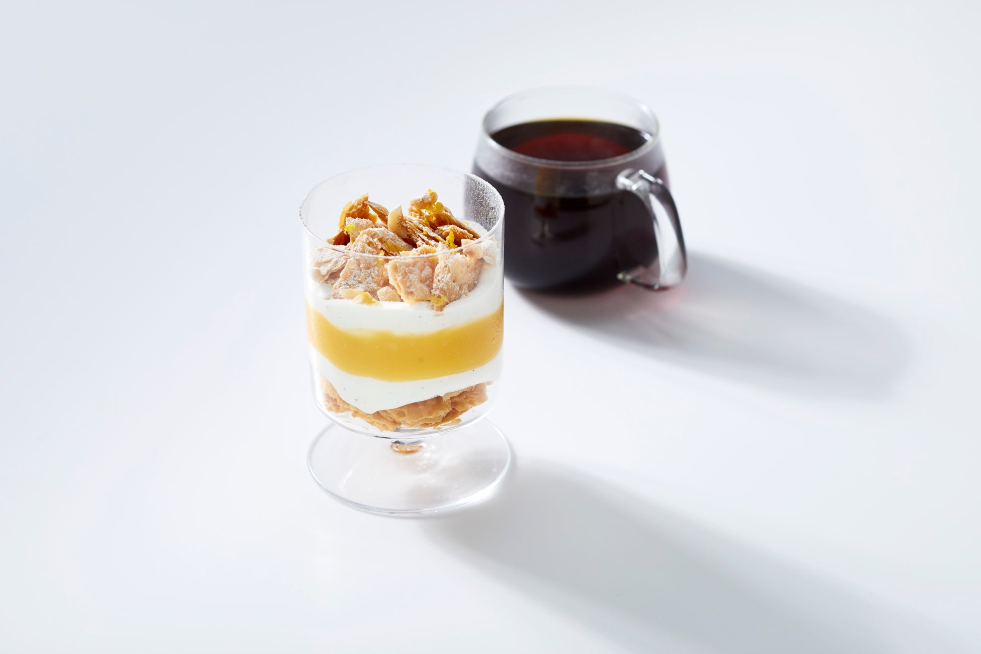 白とレモンイエローの鮮やかな層が目を引く、夏季限定のシーズナルパフェ。さくさくのパイ、バニラの香るホイップクリーム、甘酸っぱいレモンクリームとレモンコンフィ、香ばしいヘーゼルナッツなど、異なる食感と風味が織りなす贅沢な一品です。パフェの中心には、北海道・美瑛産のミルクを使用したHiO ICE CREAMの「美瑛シングルオリジンミルクアイス」を忍ばせ、やさしい甘みとともに、温度による口どけの変化もお楽しみいただけます。ひと口ごとに広がる爽やかさと奥行きのある味わいを、名古屋ゲートタワーモールカフェの洗練された空間でお楽しみください。