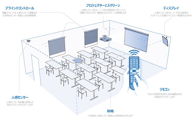 人の動作、信号感知、またはボタン押下をトリガーとして電動ブラインド、プロジェクター、ディスプレイ、照明などを自動制御。トリガー感知から任意の設定時間が経過すると自動で全ての接続機器へ電源OFF信号を一斉送信します。部屋を利用する際の無駄な準備時間や電力エネルギー消費を自動抑制します。