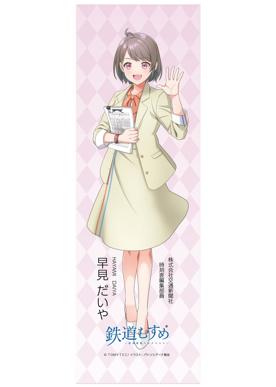 「早見 だいや」は、2025年2月にデビューした交通新聞社所属の鉄道むすめで、鉄道むすめメンバーとしては初の出版社キャラクターです。第1弾グッズはアクリルスタンドやクリアファイルを中心に好評を博し、鉄道ファン・鉄道むすめファンの皆さまからご好評をいただきました。今回の第2弾では、さらに商品ラインナップを拡充し、定番のクリアファイルに加え、特大タペストリーやトートバッグ、缶バッジなど、日常やイベントで活用できるアイテムを揃え、推し活の幅を広げる構成としました。