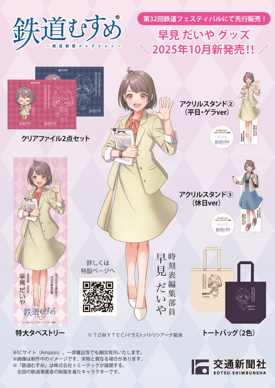 株式会社交通新聞社(本社:東京都千代田区/代表取締役社長:伊藤嘉道)は、『鉄道むすめ』早見だいやのオリジナルグッズ6アイテムを新たに発売することとし、2025年10月11日(土)・12日(日)に開催される「第32回鉄道フェスティバル」にて先行販売を開始します。