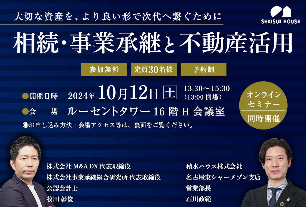 積水ハウス株式会社(名古屋東シャーメゾン支店)と共催する無料オンラインセミナー「相続・事業承継と不動産活用」(10月12日開催)に、株式会社M&A DX 代表取締役 牧田 彰俊が登壇します。