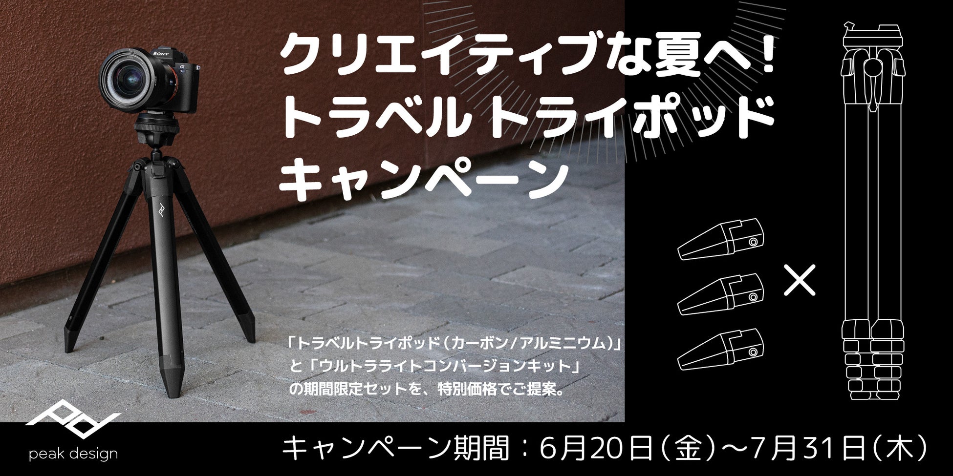2025年6月20日(金)〜7月31日(木)の期間中、「トラベルトライポッド(カーボン/アルミニウム)」と「ウルトラライトコンバージョンキット」の期間限定セットを、特別価格でご提案いたします。