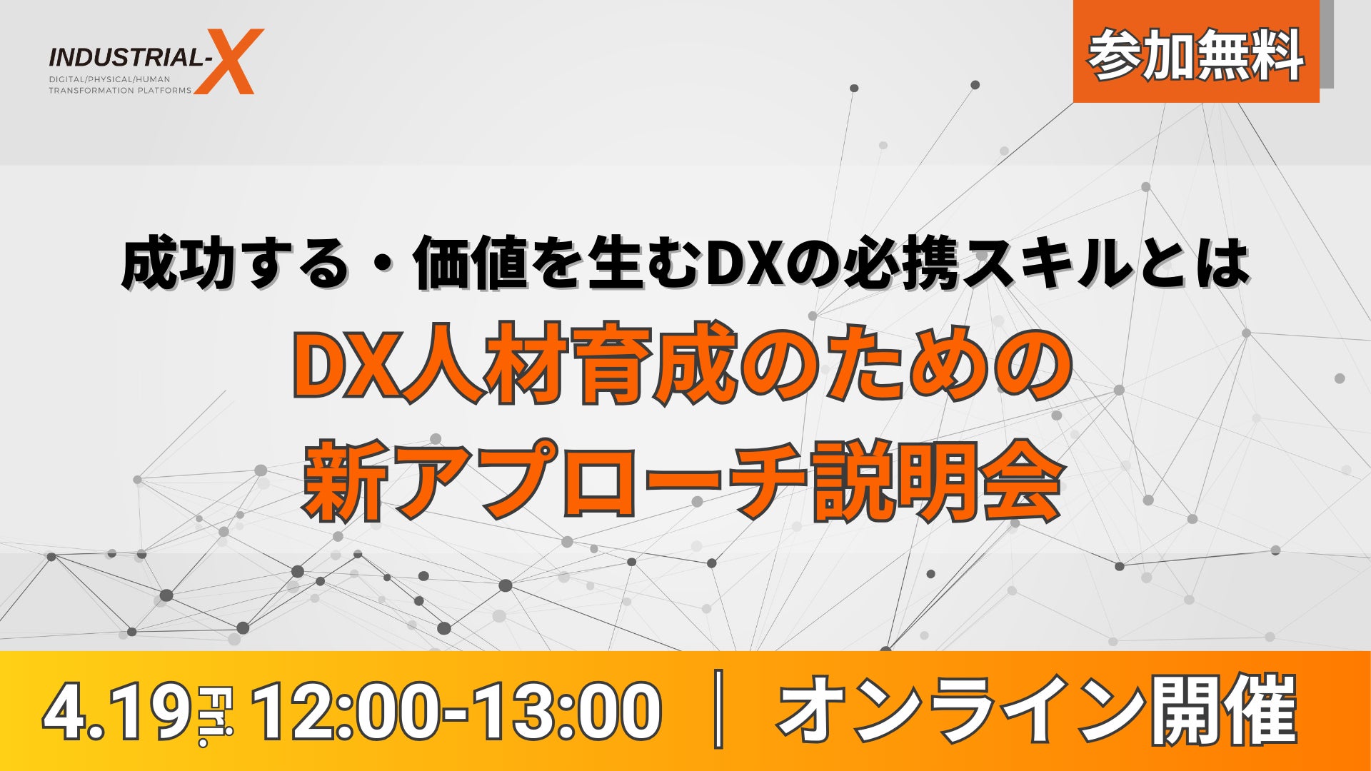 DXによる産業構造変革を推進する株式会社INDUSTRIAL-X(本社:東京都港区、代表取締役:八子 知礼、以下当社)は、4月19日(金)に、「DX人材育成のための新アプローチ説明会」〜成功する・価値を生むDXの必要スキルとは〜を開催することをお知らせします。