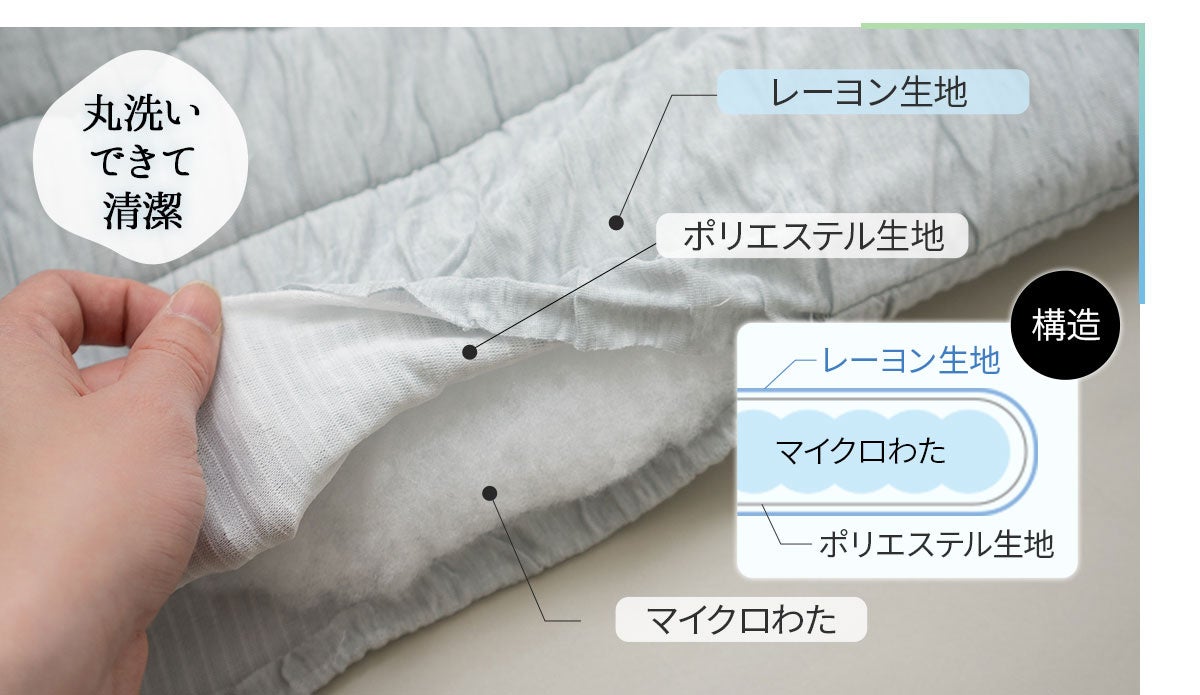 レーヨンの下にポリエステル生地を使った二重構造を採用。肌ざわりと洗濯耐久性を両立しています。デリケートな素材でも洗濯でへたりにくいので、ご自宅での丸洗いを可能にしました。
