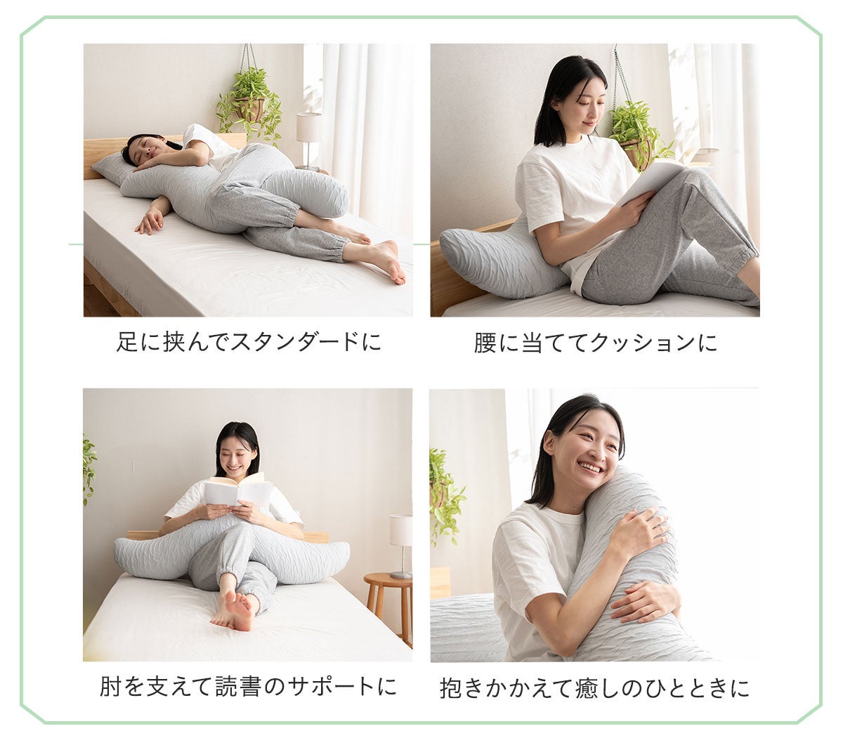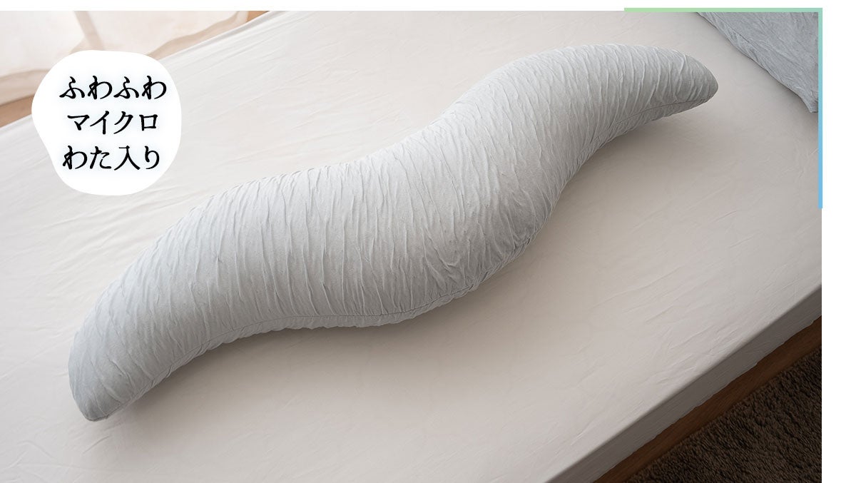蒸れやすい抱き枕の欠点を解消した、春夏向けのボディピローです。横向き寝時の姿勢サポートや、抱きしめることで得られる安心感により、リラックスした快適な眠りへと導きます。