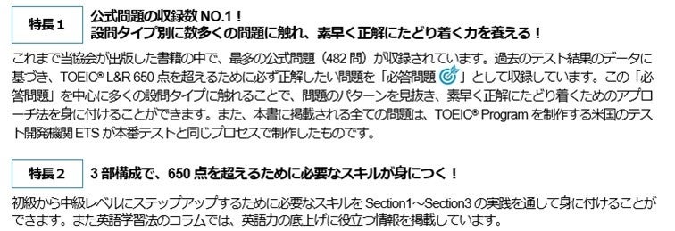 目標達成シリーズ『公式TOEIC® Listening & Reading 500+』、『公式TOEIC® Listening & Reading 800+』に続く『公式TOEIC® Listening & Reading 650+』は、TOEIC® Listening & Reading Testで650点を超え、初級から中級レベルにステップアップしたい方に向けた教材です。