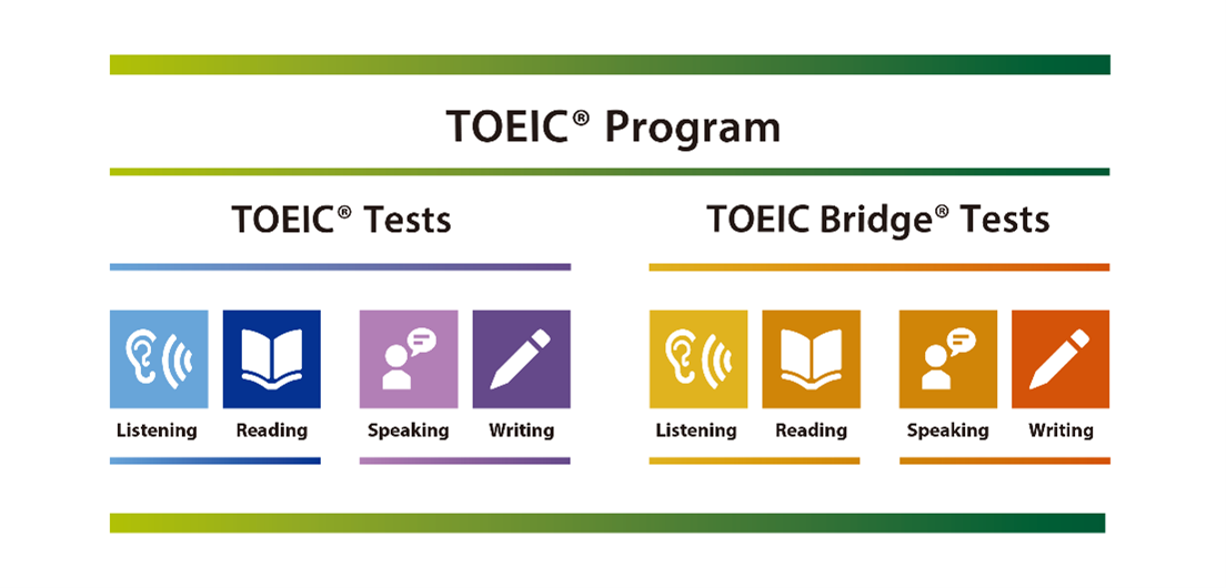 TOEIC® Listening & Reading Test、TOEIC® Speaking & Writing Tests、TOEIC Bridge® Listening & Reading Tests、TOEIC Bridge® Speaking & Writing Testsの総称。4つのテストを合わせたTOEIC® Programは世界160カ国、約14,000団体で実施されている。
