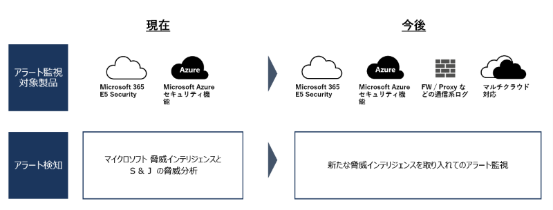 「JBS SOC」は今後、アラート監視対象をファイアウォールやプロキシなどの通信ログ、マルチクラウドまで広げることにより、「Microsoft 365」「Microsoft Azure」のセキュリティ統合監視から、お客さま環境全体のセキュリティ統合監視を目指していきます。
